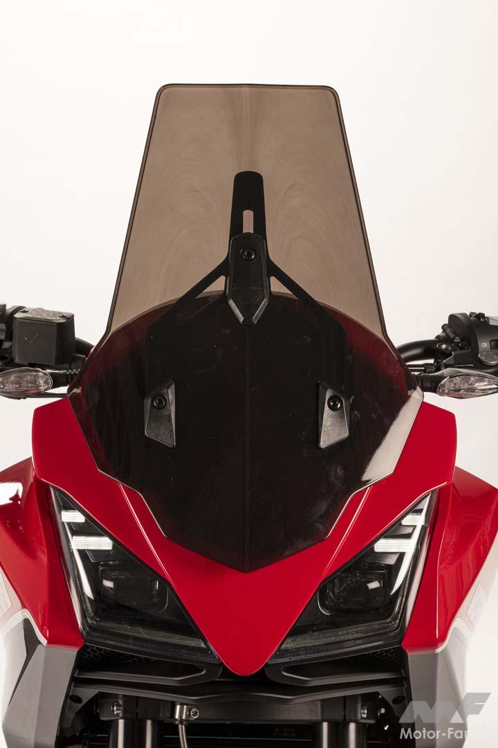 フロントにはロングツーリングでの快適性を高める、防風性に優れた大型のスクリーン(片手で簡単に高さ調整が可能)を装備。ハンドルポスト固定型のバータイプを採用したアップハンドルや、フルLEDのデュアルヘッドライトとの組み合わせにより、精悍なフロントマスクへと導いている。