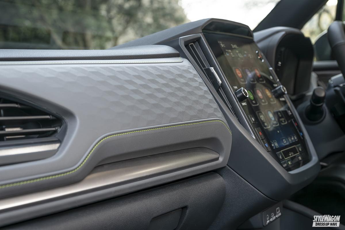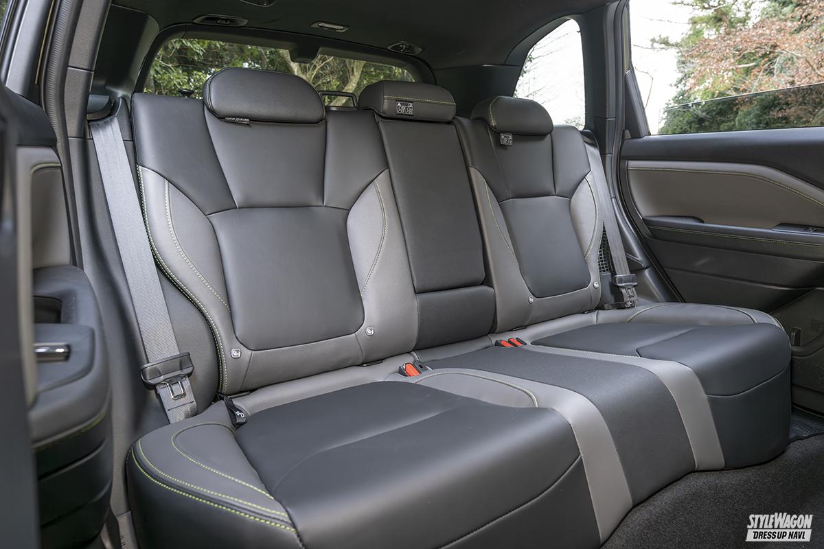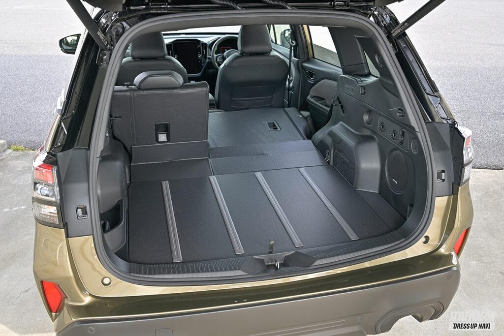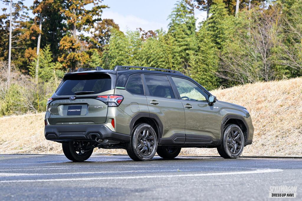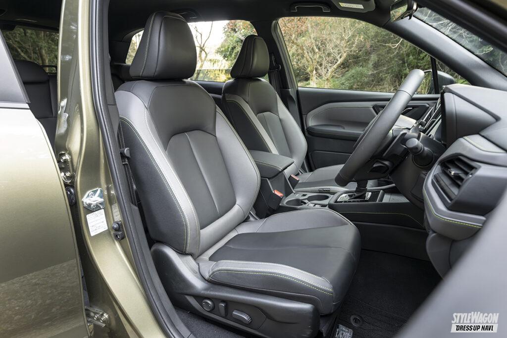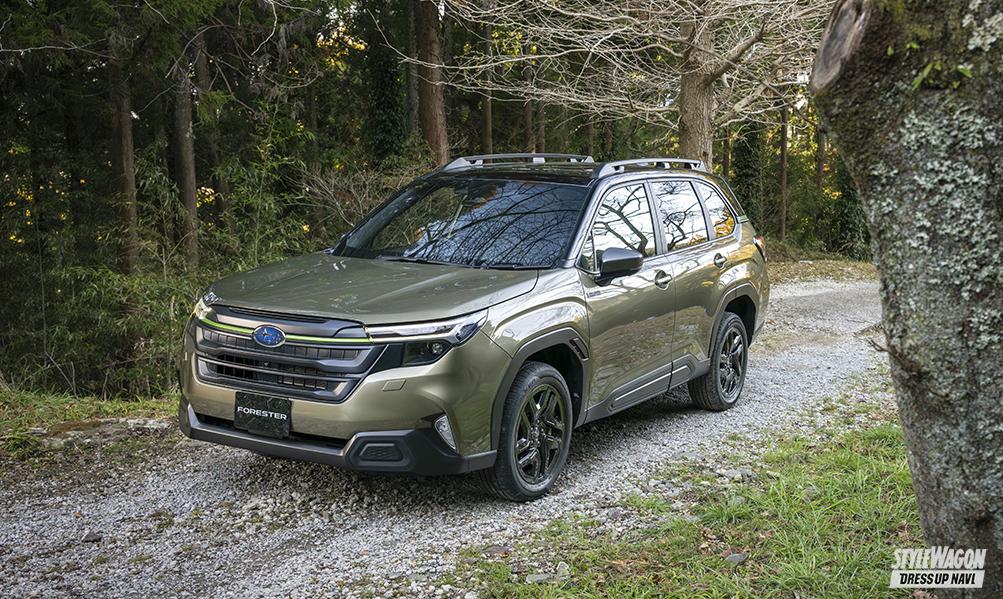 新型の外観デザインコンセプト「Ready for Adventure」を最も分かりやすく体現するのがS:HEVの「X-BREAK」。ブラックルーフやフロントグリルの「エナジーグリーン」の加飾をはじめ、Dピラー下のオーナメントもグリーンになり目を惹く。ルーフレールは、ラギッド感を醸し出すラダータイプのルーフレールを採用。さらに、ダークメタリック塗装が施された18インチアルミホイールも足元に力強さを与えている。撥水ポリウレタン/合成皮革シート(ブラック/グレー)にもグリーンステッチが配され、ラゲッジスムーザー機能付撥水カーゴフロアボードがキャンプやウインター/マリンスポーツなどの趣味に対応。上級の「EX」は、「アイサイトX」を搭載する。