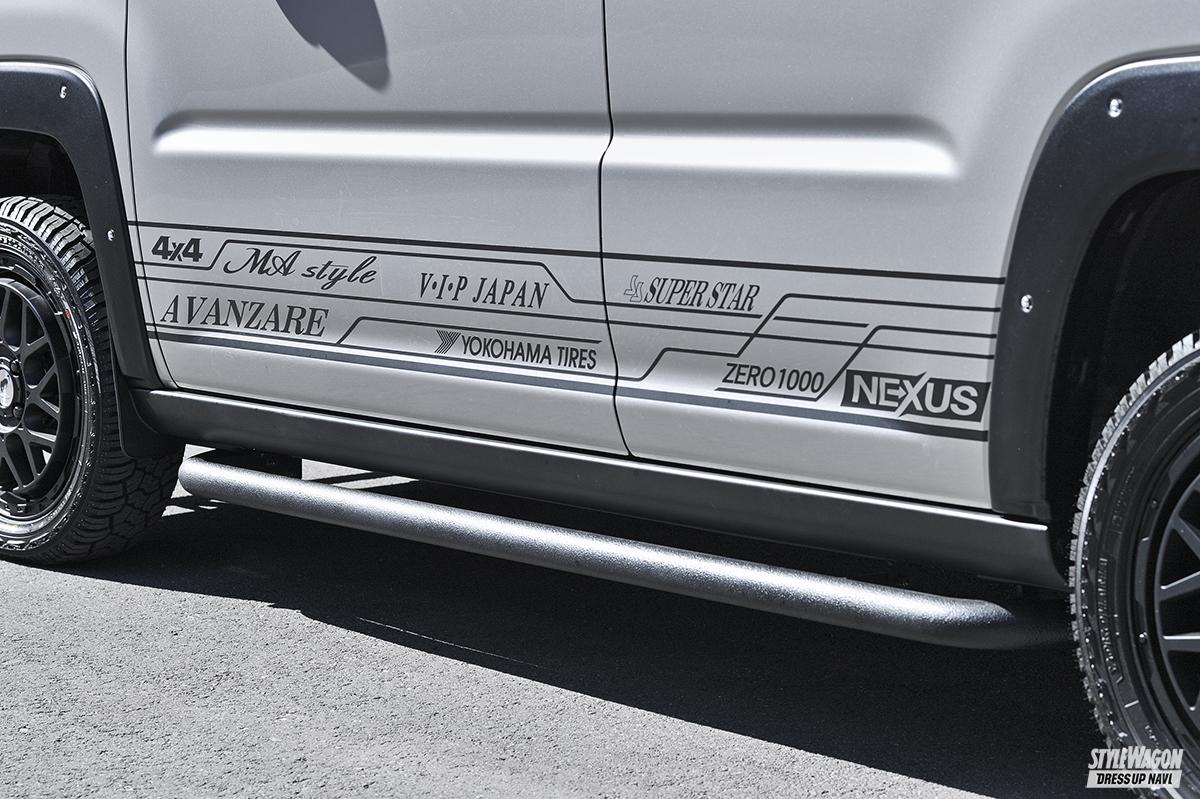 フロントまわりは2種類のバンパーガードを設定。デモカーはパイプがグリル部分まで被るバージョン1を装着しており、別売のLEDワークライトを装着できる台座も付いている。またハスラーの新グレードとして設定された、タフワイルド専用フロントグリルをどこよりも早くリリース。ブラックアウトされたライト枠を生かすべく、グリル部分に被せる手法を採用。手軽にイメージチェンジを楽しめる。サイドビューはフロントと同じく極太のパイプで作られたサイドガードバー、出幅9mmのオーバーフェンダーでたくましさを注入。リアにもセンターガードバーを設定しており、トータルバランスを追求。視覚的に車幅をワイドに見せる、左右出しのエキゾーストリアマフラーとセットで装着したい。