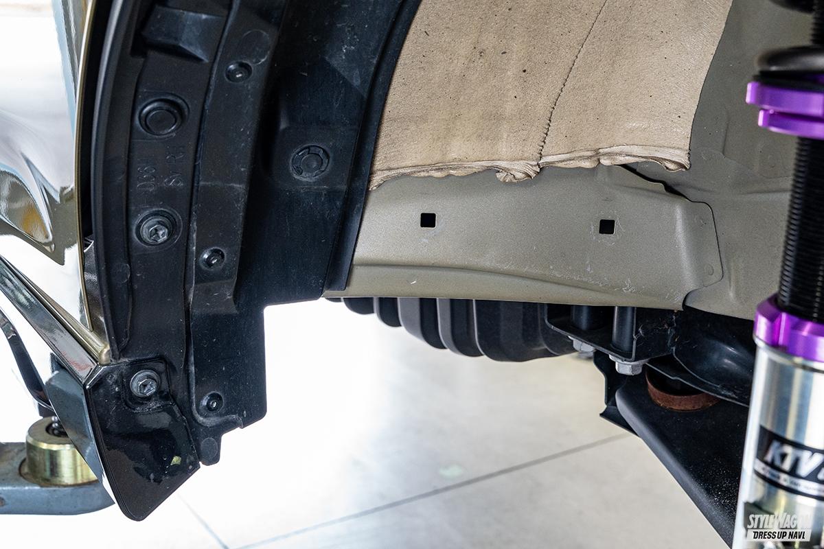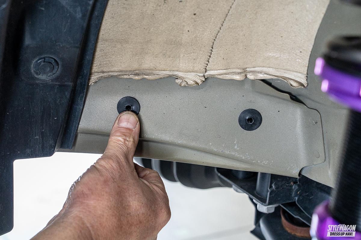 足元のドレスアップとして最適なマッドフラップ。ファッション性を上げるアイテムとしてもとっても人気だが、実は自分で付けられるほど取り付けは簡単。特にフロントは車体に元からあるサービスホールを使ってボルトで留めるだけ。なお、GTカープロデュースのフロントマッドフラップは内側までカバーするように大きく作られているので機能性も抜群だ。