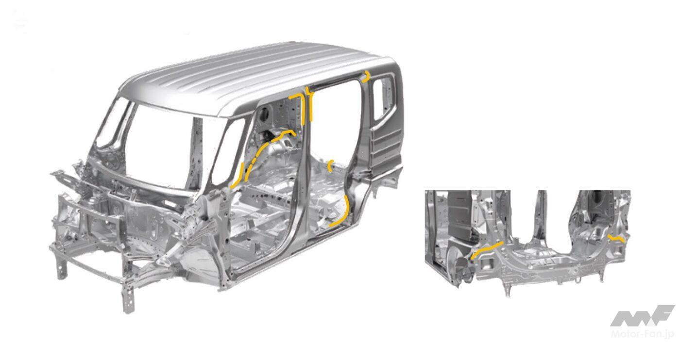 鈴木さん しています。Aピラーには冷間成形の1470MPa級超高張力鋼板を使っています。スズキの軽自動車では初めてですね。これは細くすることで視界を改善するのも狙っていますね。