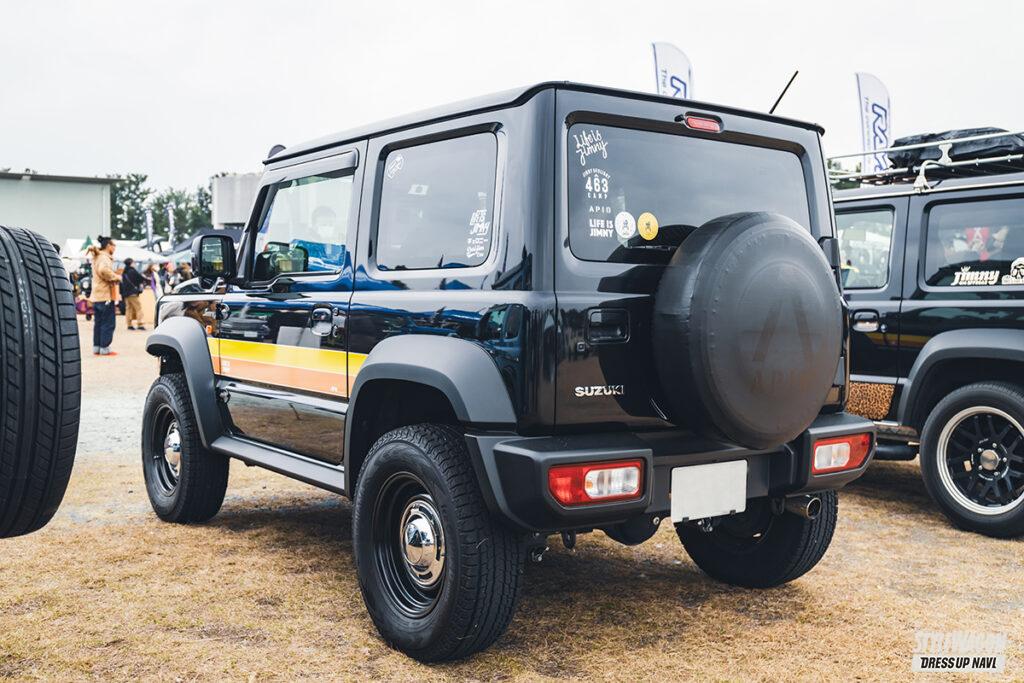 大輔さんのシエラは、マーベラスのフェイスキットがポイント。ヘッドライトが角型に変わり、縦基調の専用グリルも備わることでジムニーのイメージを大きくチェンジ。ネオクラシカルなムードが漂い、他のジムニーと差別化を図ることに成功した。オートルビーズのフロントバンパーもいい味を出しており、シンプルなデザインとステンレスの輝きはフロントマスクとの相性もバツグンだ。オレンジとイエローのレトロなサイドデカールが黒いボディカラーに映えている。ホイールはディーンのクロスカントリーと、こちらもクラシカル感漂うモデルをチョイス。足まわりはさり気なくアップ。