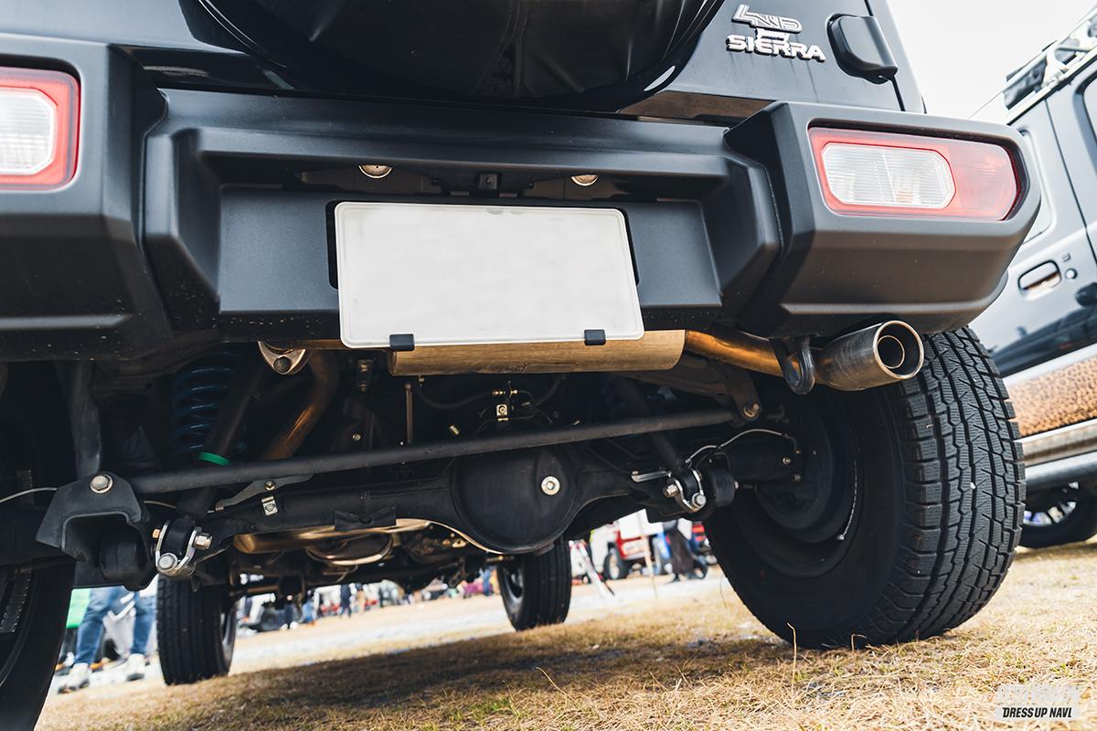 大輔さんのシエラは、マーベラスのフェイスキットがポイント。ヘッドライトが角型に変わり、縦基調の専用グリルも備わることでジムニーのイメージを大きくチェンジ。ネオクラシカルなムードが漂い、他のジムニーと差別化を図ることに成功した。オートルビーズのフロントバンパーもいい味を出しており、シンプルなデザインとステンレスの輝きはフロントマスクとの相性もバツグンだ。オレンジとイエローのレトロなサイドデカールが黒いボディカラーに映えている。ホイールはディーンのクロスカントリーと、こちらもクラシカル感漂うモデルをチョイス。足まわりはさり気なくアップ。