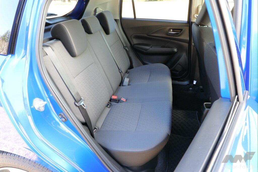 シートに関してはフロントのヘッドレストが高さ・厚みとも先代より10mmアップ。表皮は最上級グレード「ハイブリッドMZ」と中間グレード「ハイブリッドMX」がメランジグレー&ブラック、廉価グレード「XG」がブラックのファブリック。立体的な三角形柄が特徴だが、インパネ加飾に合わせたオフホワイトなど明るい色の生地が欲しいと願うのは筆者だけだろうか?