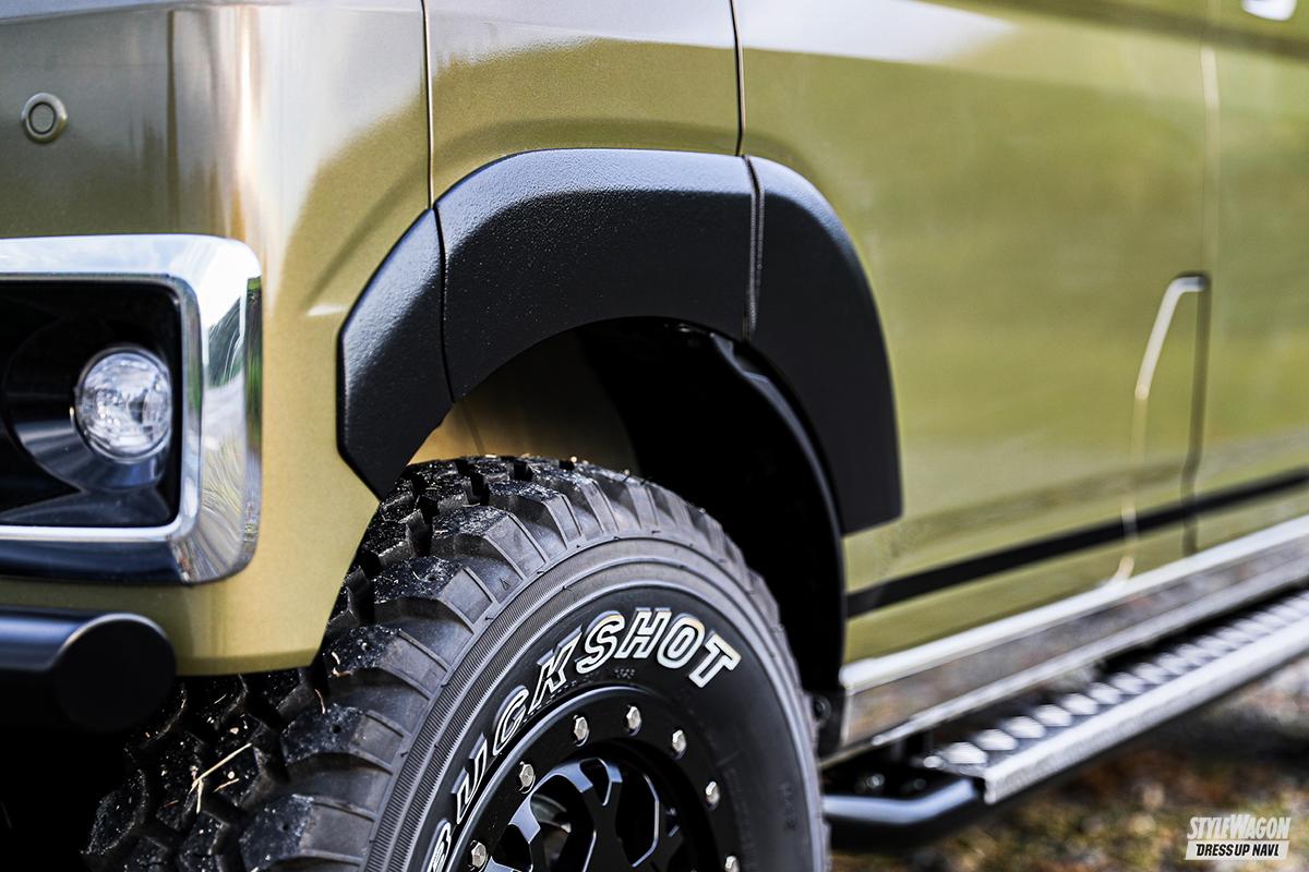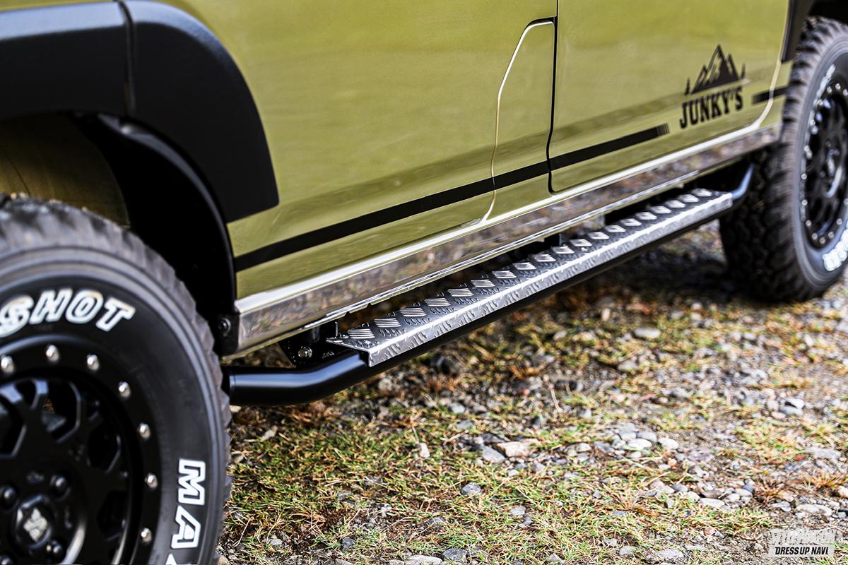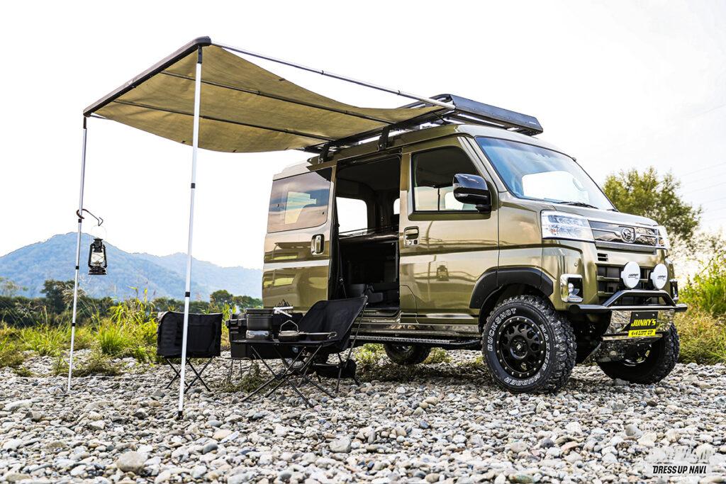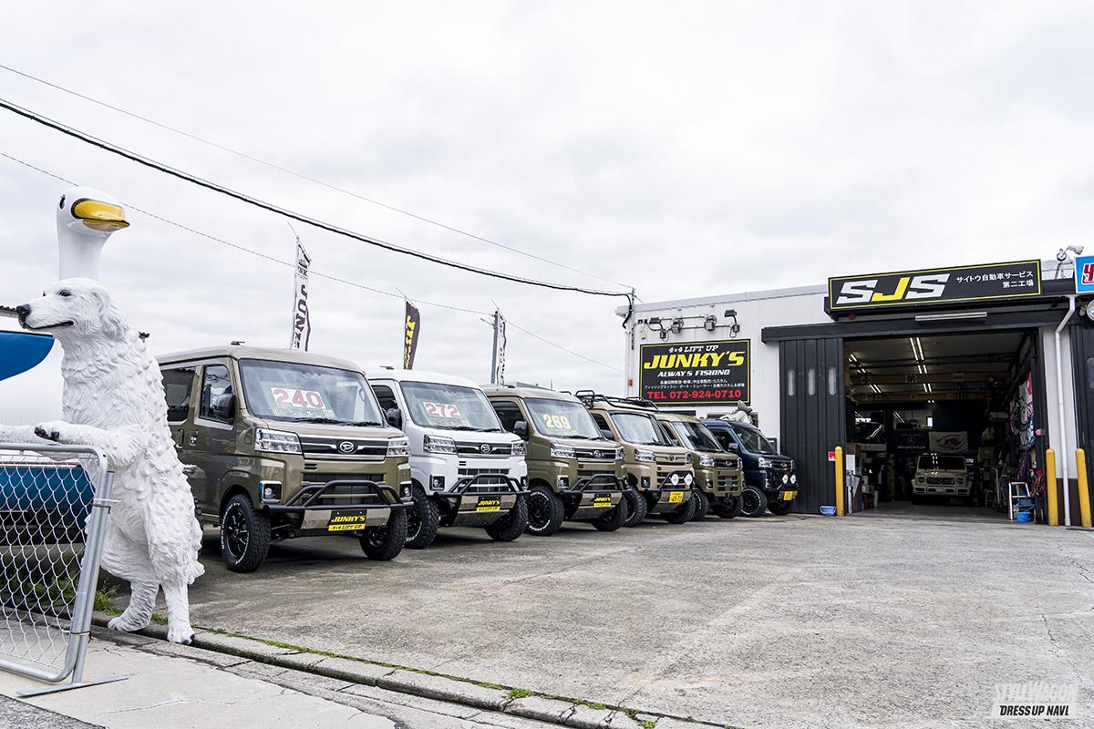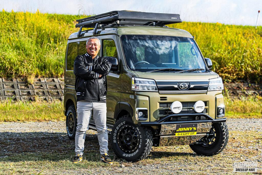 ジャンキーズのデモカーは、何といっても4インチ(10センチ)もの上げ幅が特長。これは195R14というマキシスのタイヤを履くため、というのが理由。大きくリフトアップし、大径タイヤを履くことでハイゼットカーゴ・アトレーの走破性は格段にアップする。根底にあるのは「山奥や川の先にある未開の釣り場に可能な限り近づきたい」という思い。母体となるのは大阪八尾市で40年以上自動車の整備・鈑金・塗装業を営む斎藤自動車なのだが、ジャンキーズのショップは一転、店内にルアー専門店を構え、さらにキャンプグッズも扱っている。車両のカスタムはもちろんのこと、「アウトドアを楽しむための様々なギアが揃う」お店というわけ。つまるところ、ジャンキーズが提供しているのはクルマだけでなく、ライフスタイルや趣味のある人生なのだ。無類の釣り好きである斎藤代表も言う。「ジャンキーズは完全に僕の趣味の延長です。自分が欲しいと思うクルマやパーツを作るのはもちろんですが、趣味仲間が集まれる場所の提供という側面もあります。歳を重ねると出かけるのが億劫になりますから」。なお、冒頭のリフトアップはS700アトレ—・ハイゼットカーゴ専用のブロックキットで上げている。ダンパーやスプリングは純正を利用。さらに豊富なラインアップを誇るフロントのパイプバンパーやシンプルなデザインのリアバンパーなど、数多くのアイテムを抱えるのも同社の強み。また、追加費用は必要となるが、多少のアレンジにも対応してくれるという。