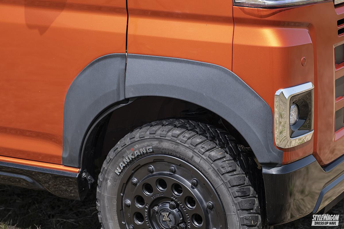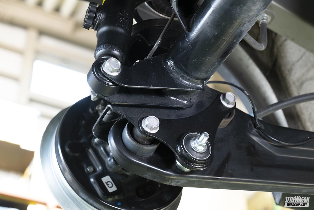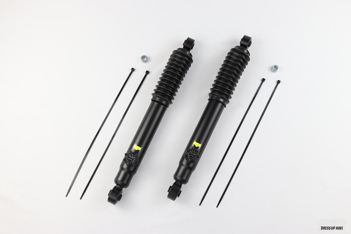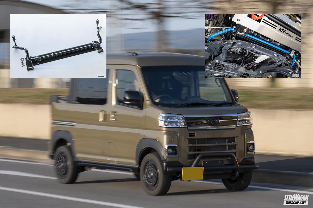 まずふらつき改善策として、スタビライザーキットの装着がオススメ。安定感が増し、高速道路を走る際の不安を解消できる。また直進安定性を向上させたいなら、リアショックの交換を提案したい。減衰力調整機構付きだから、積んでいる荷物の重さや走るシーンに合わせてセッティングできるのが魅力。アクスルブッシュの不快な挙動を抑制するアクスルリジッドプレートも導入すればさらに安定した走りを実現。そして今が旬のオフロードカスタムにマッチしたリフトアップキットも用意。前後の足まわりにスペーサーをかませて上げる手法だから乗り心地の影響が少ないのが嬉しい。手軽にアゲを楽しみたい人に最適だ。