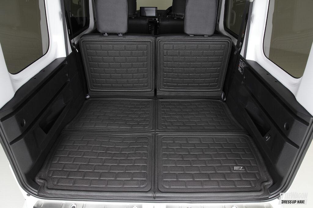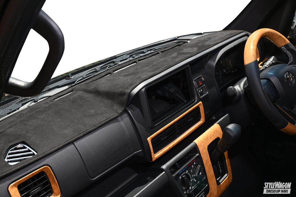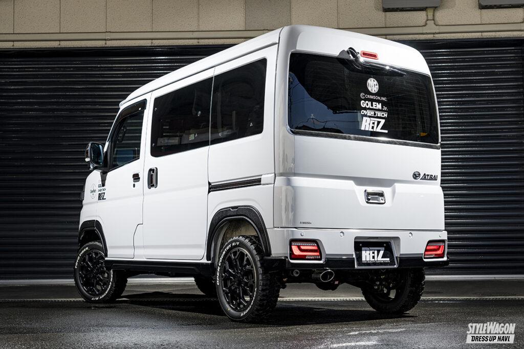 クルマ1台に対する専用パーツの豊富さがライツの強み。だから自社のパーツだけで内外装のトータルコーディネイトが可能となる。ひとつずつパーツを選んで進化を楽しむのも良いし、一気に取り付けてガラッと雰囲気を変えるのも良いだろう。アトレー&ハイゼットカーゴもすでに多くのパーツをラインアップしており、クルマを買ってこれからカスタマイズを始めたいユーザーの期待に応える。エクステリアに関しては、マフラーにも使われる高品質のSUS304素材を採用したステンレスパーツが豊富。基本的に両面テープで貼るだけだから誰でも簡単に施工でき、それでいて大きな見た目の変化を味わうことができる。フロントまわりはボトム部に装着するアンダーカバーやグリルカバー、サイドもドアハンドルカバーやドアミラーカバーなど多くのパーツを用意。リアまわりも抜かりなく、バックドアまわりを彩るパーツをメインに取り揃えている。今回のデモカーのようにちょっとオフロードに決めたいなら、出幅9mmのオーバーフェンダーがオススメ。フロントバンパーアンダーカバーはラギッドなデザインのタイプ2を合わせるのがベターだ。
