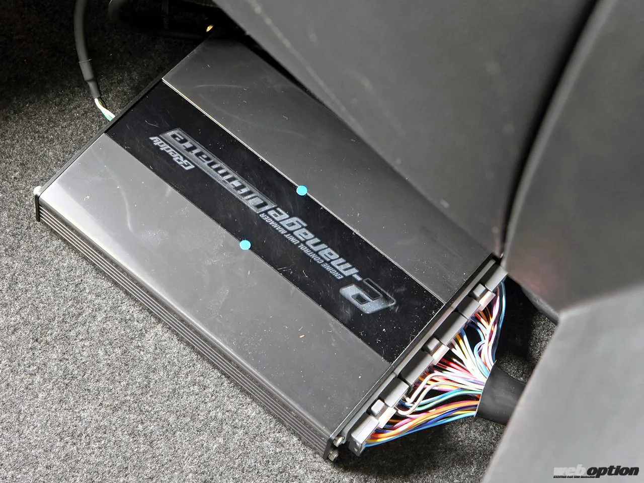 重要なエンジンマネージメント(燃調、点火時期、バルタイ、スロットル)は、基本的には純正ECUの書き換えでセットアップを進めている。しかし、純正ECUではターボ領域に対応できないため、eマネージアルティメイトを追加して正圧領域を制御している。