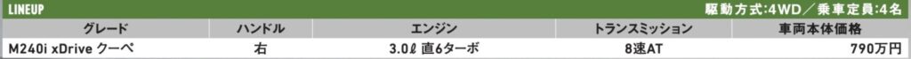ほかの2シリーズは横置き前輪駆動ベースだが、クーペはこれまでどおり縦置き後輪駆動ベースで、4シリーズ等と同じCLARプラットフォームをベースとしている。Mパフォーマンスモデルである「M240i」には、387㎰の最高出力と1800〜5000rpmという幅広い回転域で500Nmの最大トルクを発生する直6ターボが搭載され、従来あった6速MTの設定はなく、6速ATのみとなっている。