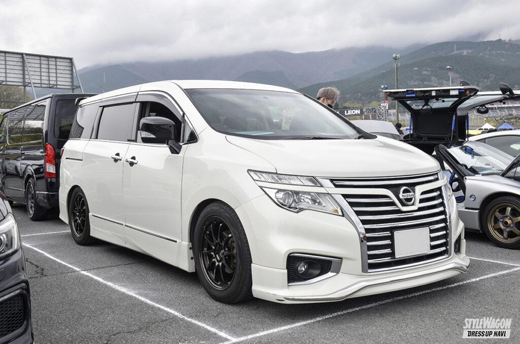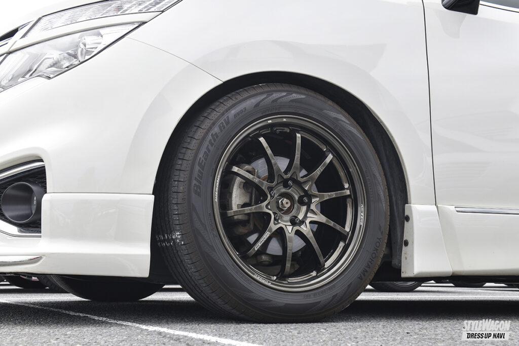歴代エルグランドを乗り継いできた川村さんは、オーラニスモも所有する日産党。先代のE51で定着したスポーティなイメージをE52でも強調させるべく、スポーツ系ホイールの中から鍛造のボルクレーシングCE28Nプラスを選ぶ。「本当はTE37が欲しかったけど当時は半年待ちで、納期が早かったコレにしました」。ホイールに合わせて外装も走りを感じるパーツを厳選。