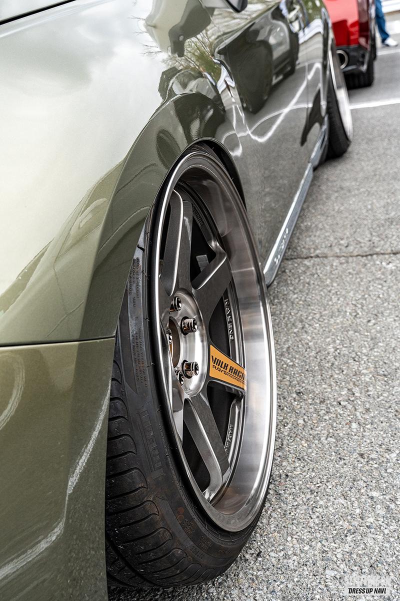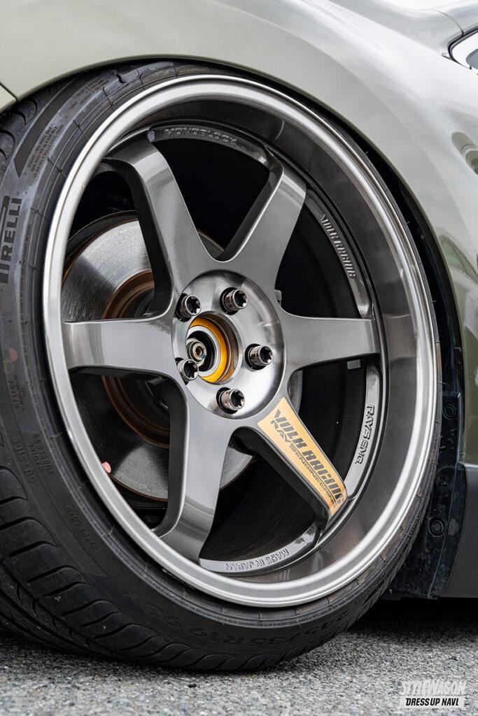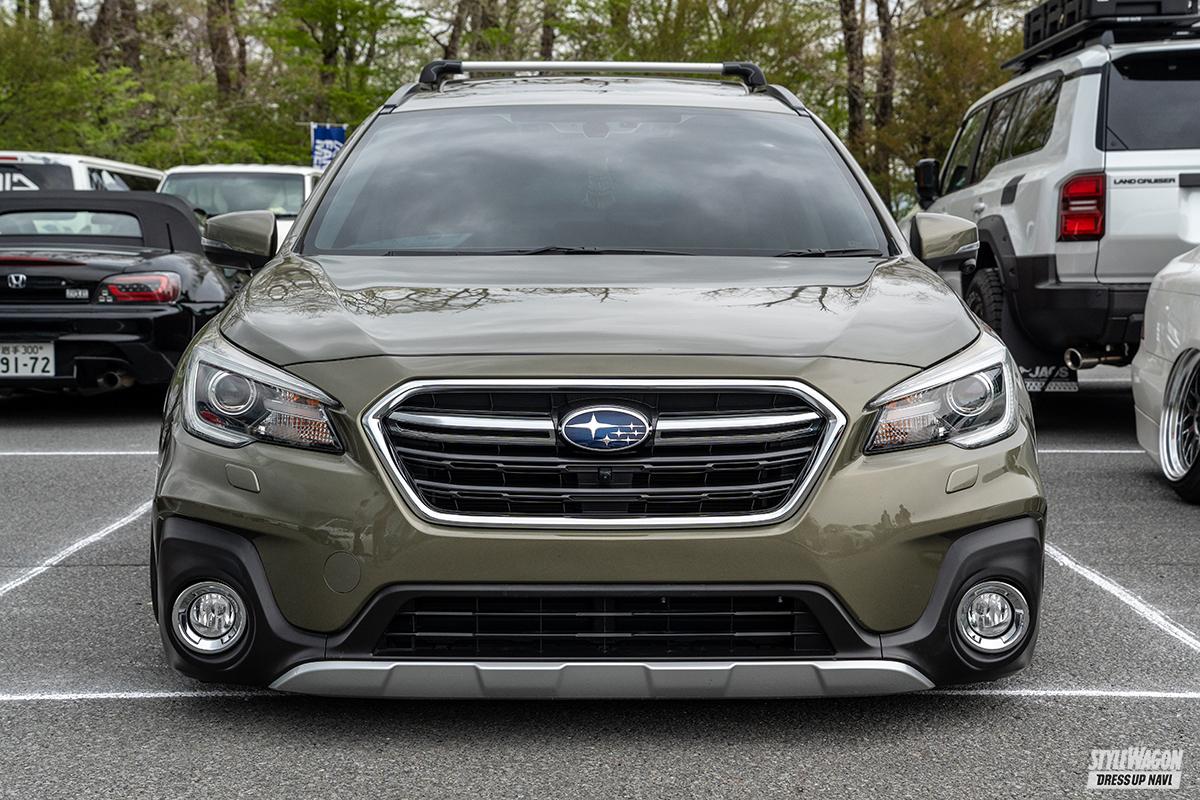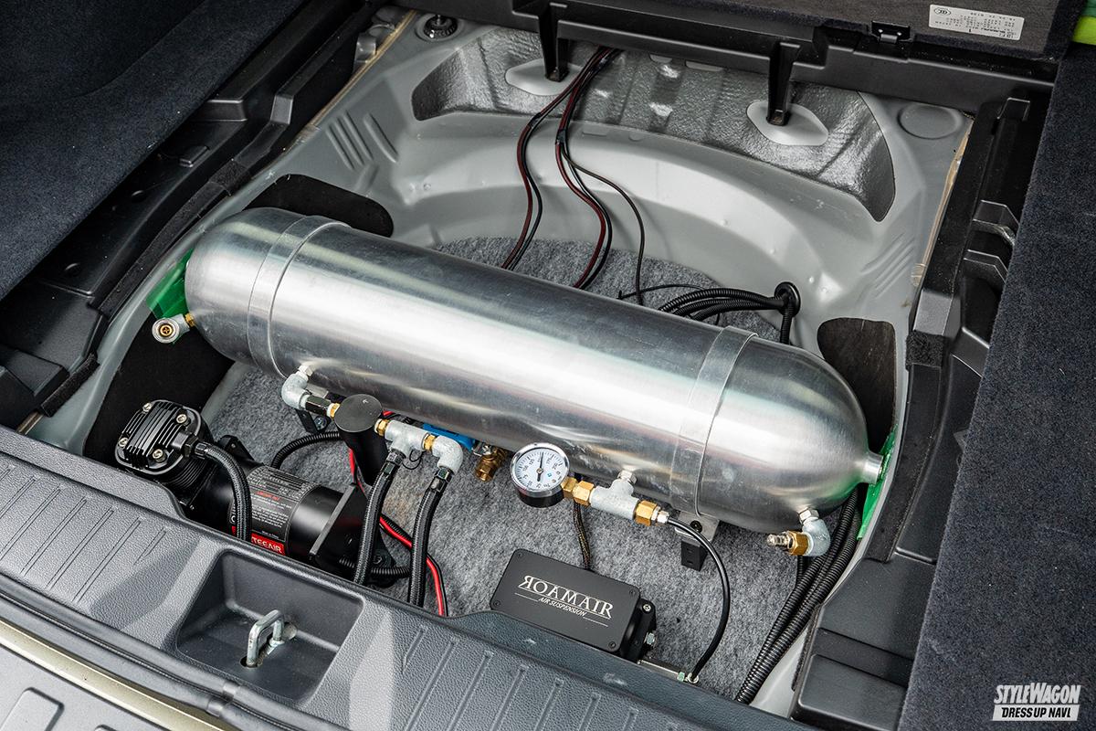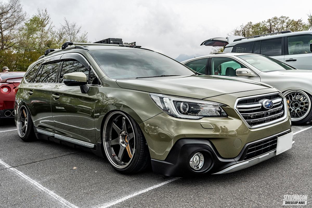 18クラウンでスタンス系カスタムをしていた竹井さん。1年ほど前に「実用性が欲しかった」とアウトバックに乗り換え。足は最初からエアサスでDIYでインストールした。キャンバーボルトやアッパーアーム加工、リアフルアーム化などでこの車高を具現化。「これまではBBSを履いていて、レイズはこのTE37SLが初めてなんです」と足をセットアップし、USDMを目指している。