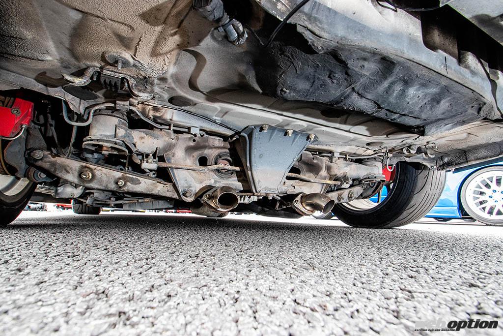 エキゾーストマフラーはリヤサスメンバー直後の腹下で解放する。これは大型ディフューザーのインストールを想定したメイキングだ。