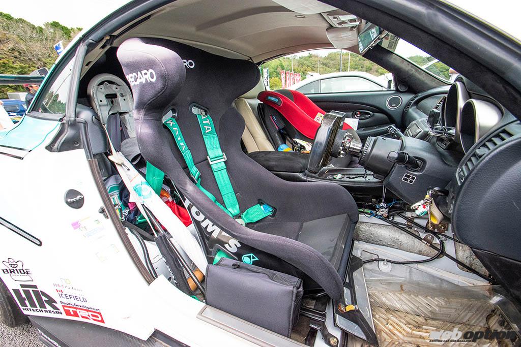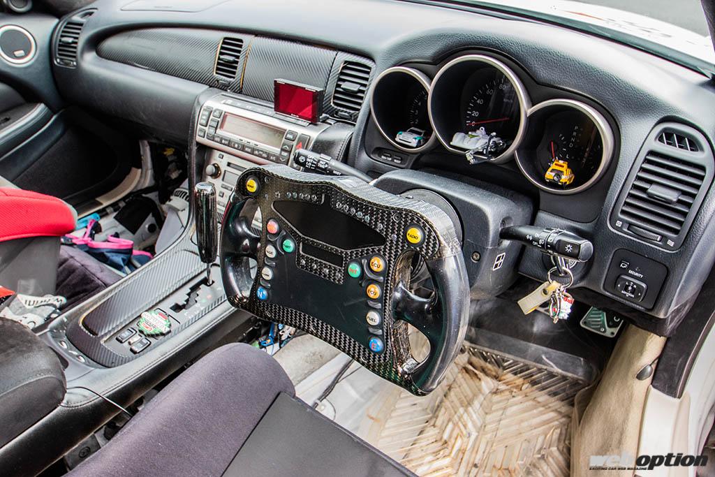 まだ製作途中とは言うものの、コクピットもスパルタンな作り込みとなる。ステアリングはスーパーフォーミュラに使われていたという本物を採用。背面にボスを後付け加工することで、一般的な社外ハンドル同様の取り付けを実現している。なお、コラム部のメーターやスイッチ類は配線が難しいため機能させていないそうだが、存在感は圧倒的だ。