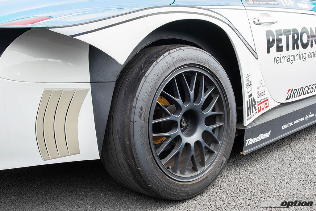 とはいえ、レプリカを製作するためには本物の寸法などを知る必要がある。そこでオーナーはツインリンクもてぎに展示されていたPETRONAS TOM’S SC430を2時間かけて調べ上げ、スーパーGTマシンと全く同じタイヤ外径(265/45-18)にブリスターフェンダーの形状を落とし込んでいくところからメイキングをスタートした。