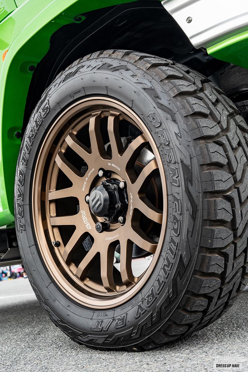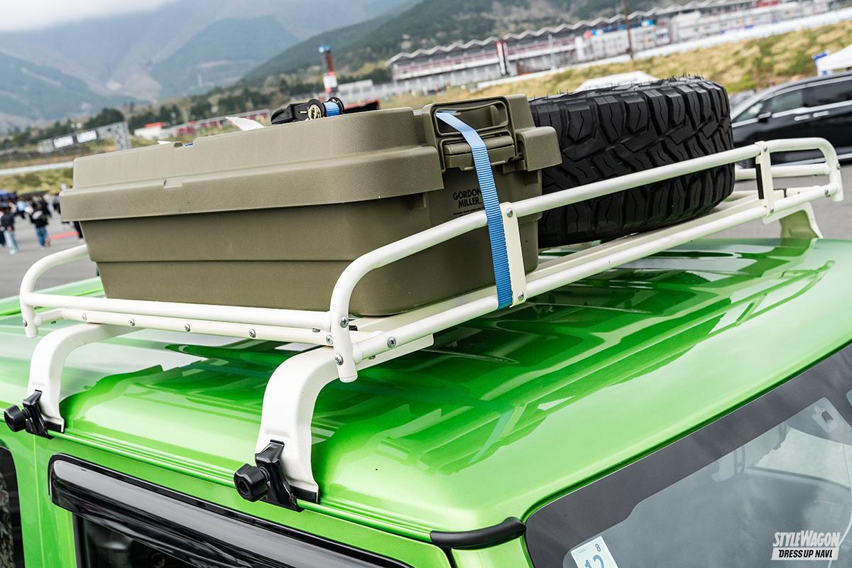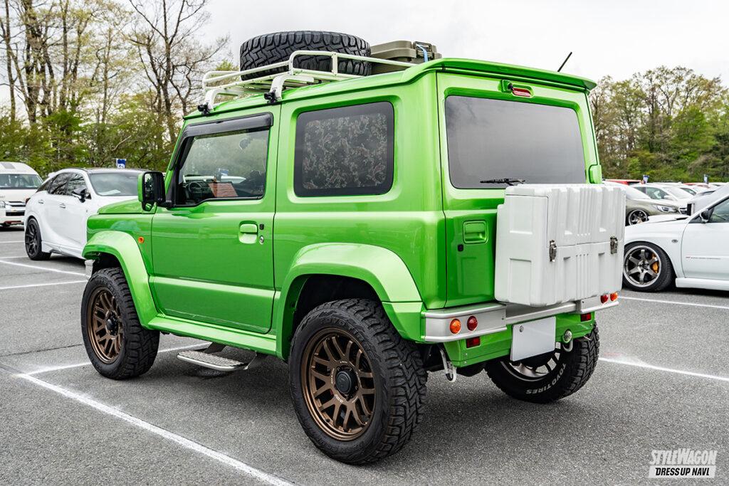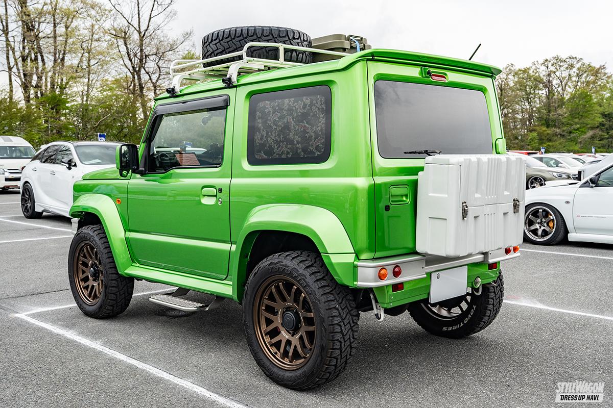昨年1月に車両を手に入れた段階で「カスタムに関してのイメージは全てコンプリートしていました」と語る旦那様。奥様のジムニーグランマさんのために、1台丸ごとカスタムを敢行。「人と違うクルマに乗りたいという思いを形に!」とデミオ純正グリーンメタリックオールペン、ダムド·リトルBの前後にビヨンドジャパンのサニーフェイスグリルを合わせる。