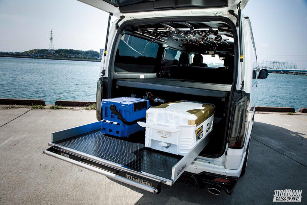 アウトドアや車中泊、釣りにモータースポーツにと多彩に活躍するハイエースだから、その機能性をアップさせてさらに快適に、便利に楽しめる一台へとブラッシュアップすることも忘れたくない。奥に積んだ荷物を取り出しやすいスライドレールや収納力バツグンのコンソール、外でも使えるベッドキットなどは特に超便利。荷物を満載しても後方が確認できるデジタルミラーも必須だ。