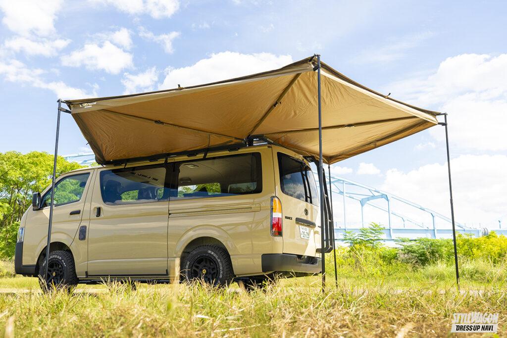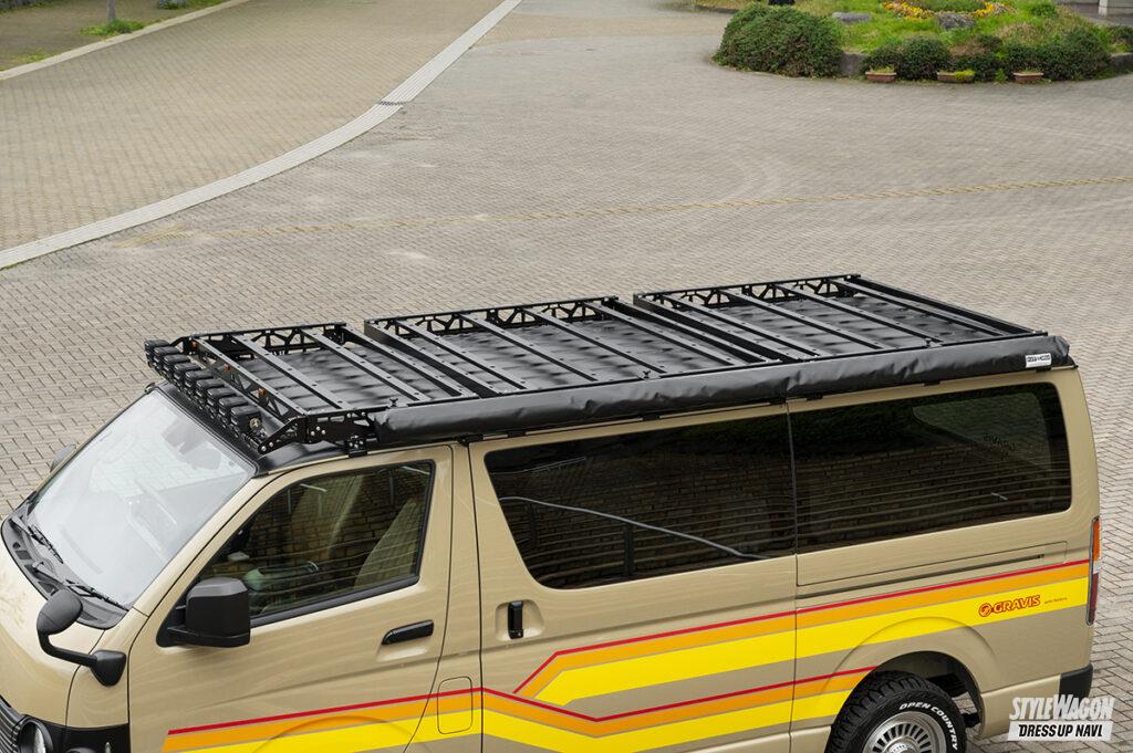 キャンプやアウトドアレジャーでハイエースを使い倒したいのなら、自然の中でこそ活躍してくれるギア系パーツの強化も必須だ。荷物の積載量を増せるルーフキャリアやキャンプに欠かせないオーニング、車中泊ならぬ車上泊で非日常を楽しめるルーフテントなどは特にオススメ。ベッドキットやシンク、家具といったキャンピング仕様アイテムにも注目。