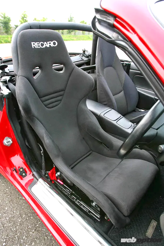 シートはレカロのTS-Gをチョイス。「レカロ既存のモデルはショルダー部がドアに干渉してしまっていたんです。それがTS-Gになってクリアされました。お勧めですよ」とマルハモータース荻野さん。