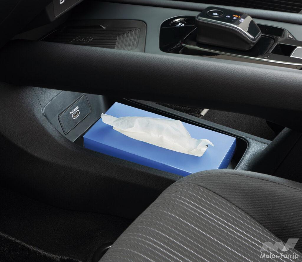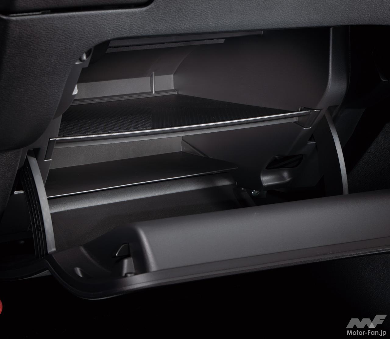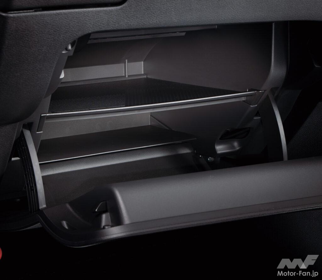 助手席側にあるグローブボックスは容量を拡大。収納スペースを上下2段に仕切ることで、取扱説明書やティッシュボックスなど、かさばりやすいものがすっきりと収納でき、利便性を向上している。
