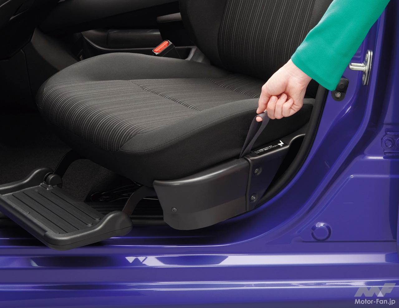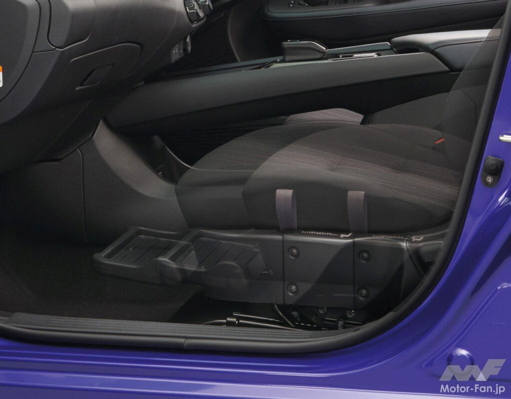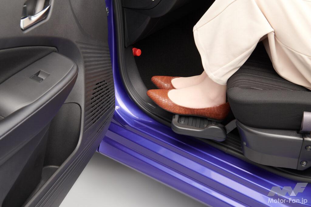 助手席回転時の足元スペースはクラストップレベルを確保。助手席回転シートに装備しているフットレストを使用することで、よりスムースに乗り降りすることができる。
