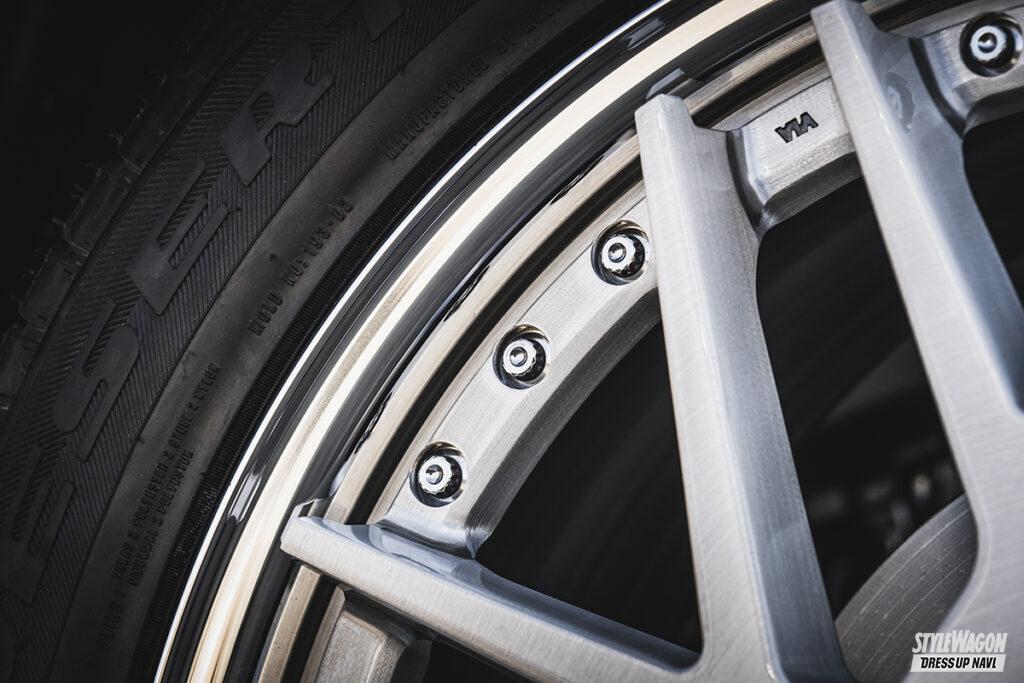 8交点のクロススポークにヒネリを効かせたアシンメトリーな造形は、適度に太いから力強く、超大口径サイズでも細く見えすぎないのが特徴。250専用サイズではリム深度が31㎜となるなど存在感も強烈で、ぐるりと全周に配置されるピアスボルトが放つ絶対的な高級感も武器だ。