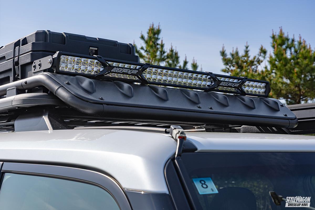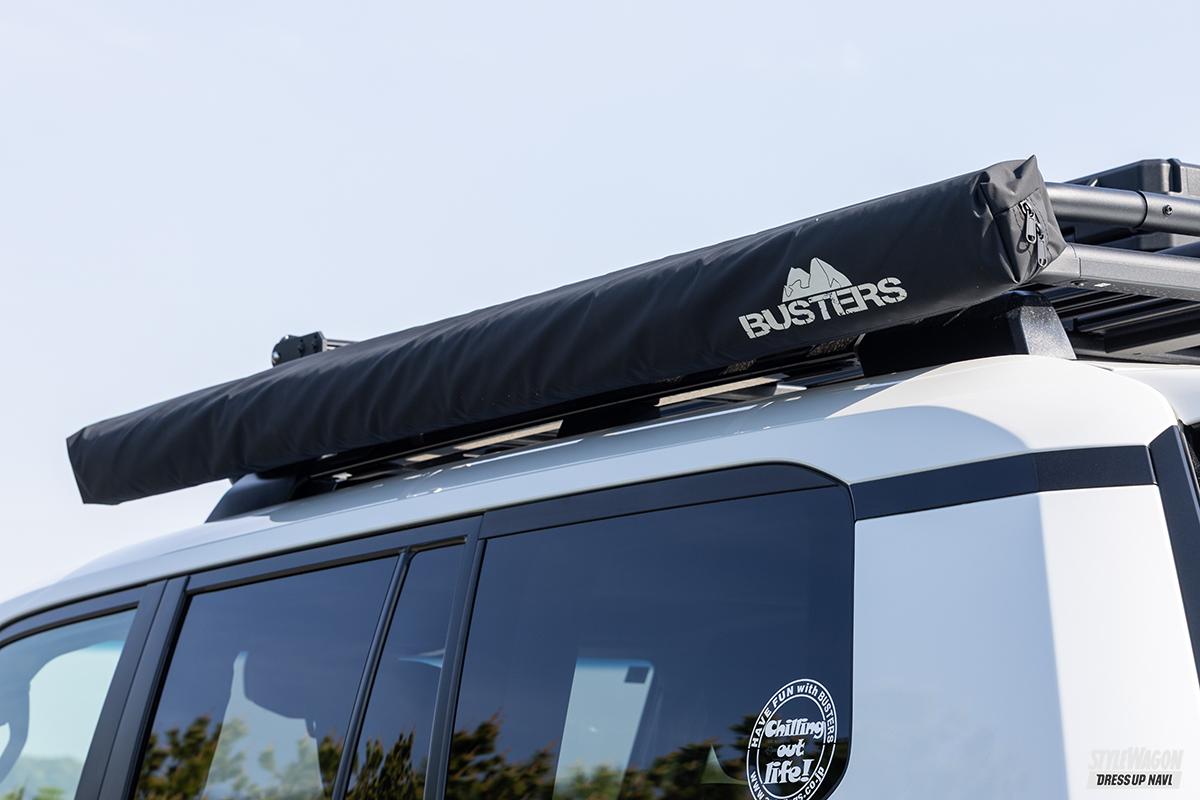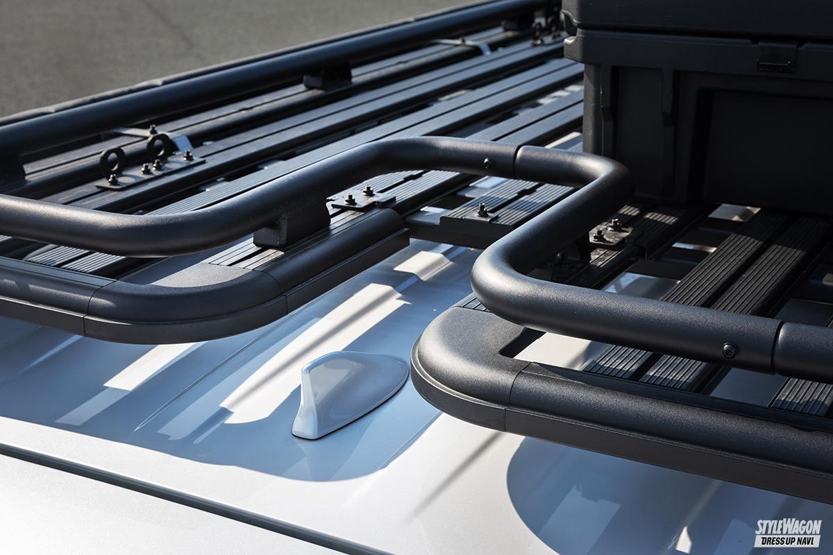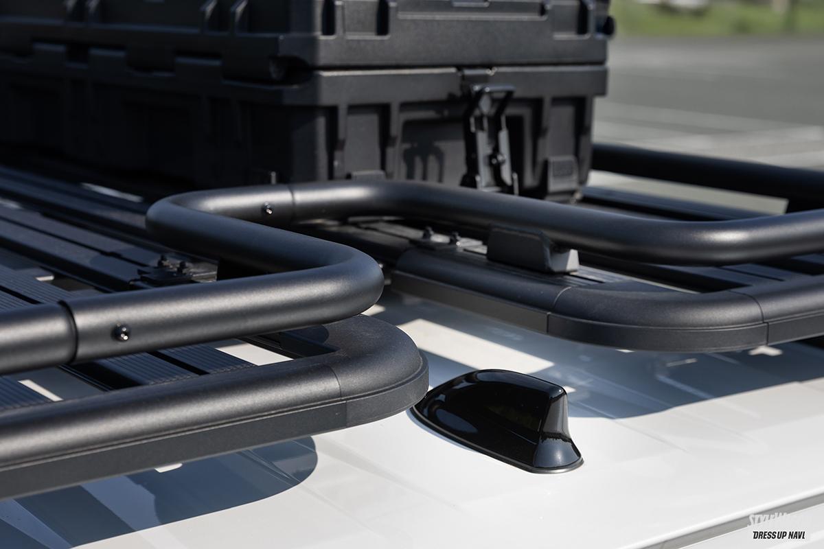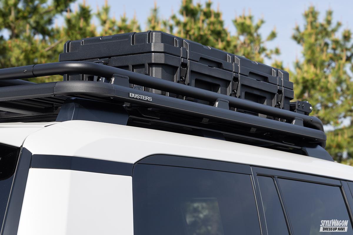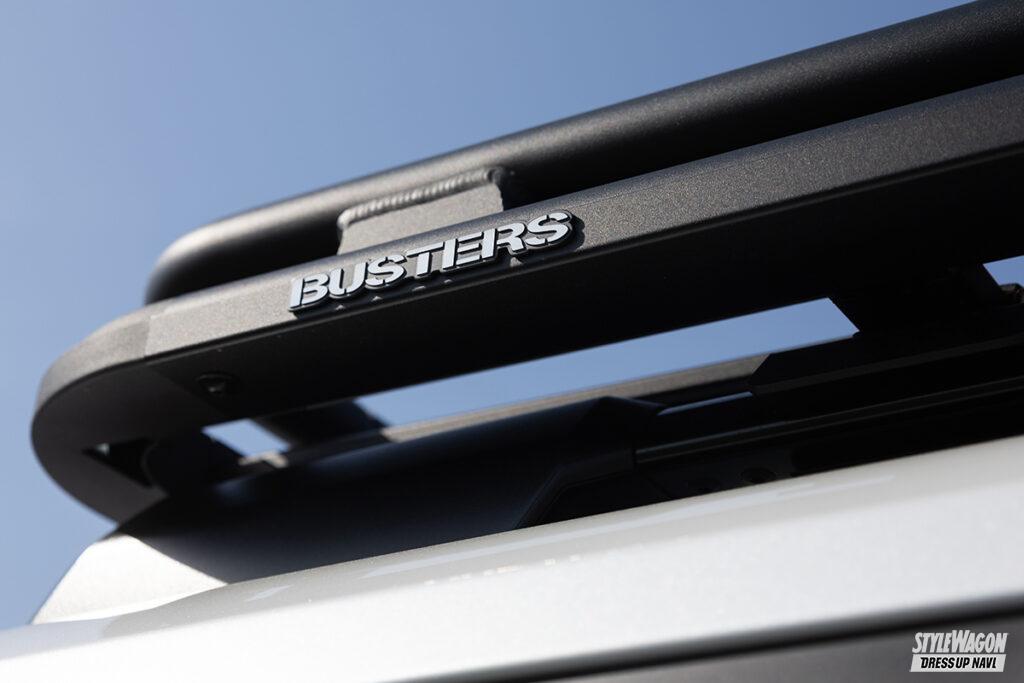 ルーフラック本体部分には軽量かつ高品位のアルミ押し出し材が使用されており、表面にはカチオン処理を行なった後にブラックのパウダーコート(粉体塗装)を施工。スチール製の補強材とフット部分についても同じようにパウダーコート仕上げが行われ、優れた耐候性と対腐食性を実現。最大積載量は250/300用、どちらも50㎏と十分な対荷重性を確保。加えて、同製品の大きな特徴となっているのが空力特性。ルーフキャリアを使用した経験がある方ならご存知の通り、高速道路の走行中に聞こえて来るキャリア部分からの風切音や積載物の凸凹による空気抵抗が与える操縦性への影響は意外なストレスになりがち。この点を解消すべく、バスターズには優れた整流効果をもたらす樹脂製フェアリングを標準装備。独自の低重心マウントも違和感の無いドライバビリティの実現に貢献している。