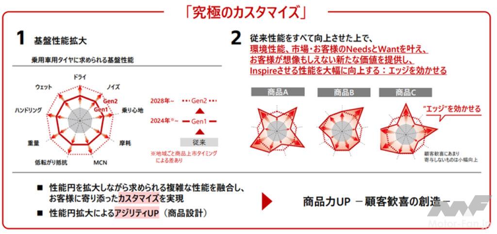 ※ブリヂストン製品内において、エンライトン技術により市場・地域ごとにタイヤ性能をカスタマイズすることを表す。究極とは企業としての目標を指す。