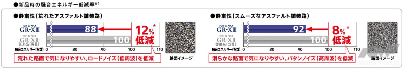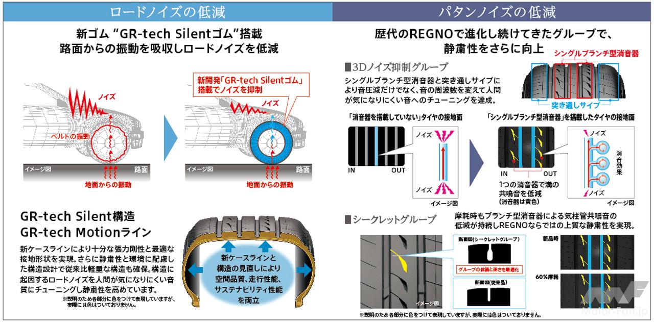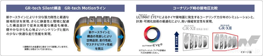 「レグノGR-XⅢ」は、1981年の登場以来、一貫して同社が提供してきたレグノのブランド価値「GREAT BALANCE」を、エンライトン技術搭載により新たな次元へ進化させ、“新たなレグノ・フィーリング”の提供を可能にした。レグノのコア・コンセプトである静粛性に加えて、ハンドリング性能にもエッジを効かせることで、“静か、やわらか、安らか、気持ちいい、滑らか”というレグノ史上かつてない空間品質と質の高い乗り心地を両立した新しい“レグノ・フィーリング”を、エンライトンによる「究極のカスタマイズ(※)」で実現。国産車はもちろん、輸入車やBEVといった幅広い車種で、この新しい“レグノ・フィーリング”を堪能することができる。