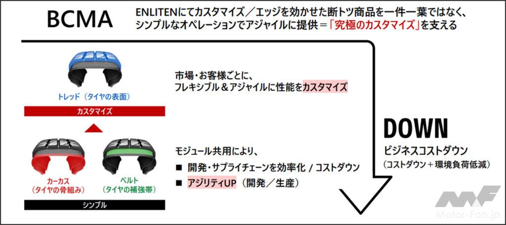 ※Bridgestone Commonality Modularity Architectureの略。タイヤを構成するモジュール(部材)を3つに集約し、異なる商品間で共有することで、開発・生産を含むサプライチェーンをシンプル化。開発・生産におけるアジリティを向上させながら、コストの最適化や環境負荷の低減を実現する。革新材料・構造によってモジュール化を進化させ「究極のカスタマイズ」を支える。