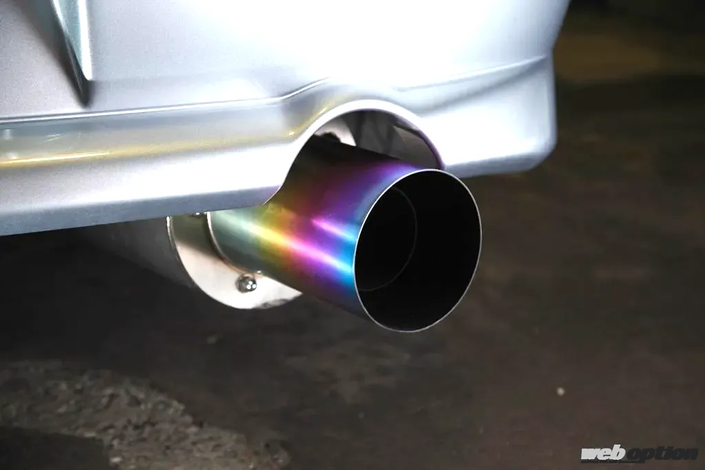 エキゾーストマフラーは、メインパイプ径90φのワンオフチタンに交換。75φフロントパイプと併せて排気抵抗の大幅な低減を実現している。その他、マルシェのすじがねくんやロワアームバー、ドゥーラックフロアサポートバーやトランクエンドバーなどでボディも補強。