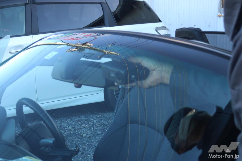 取付の際は、スマホのNP1アプリを利用した位置決め機能で取付位置を決定し、本体をフロントガラスにアタッチメントに付属する両面テープで接着して固定。電源はシガーソケットから取ることが出来る。まず動作テストとして、自身で別のクルマに装着してみたが問題なくできた。