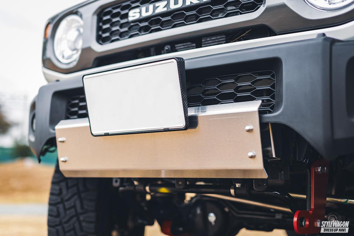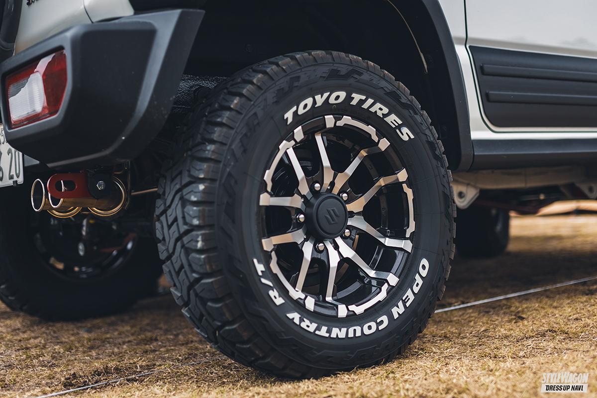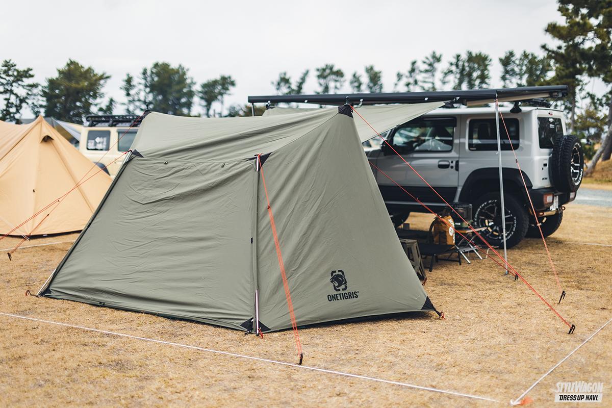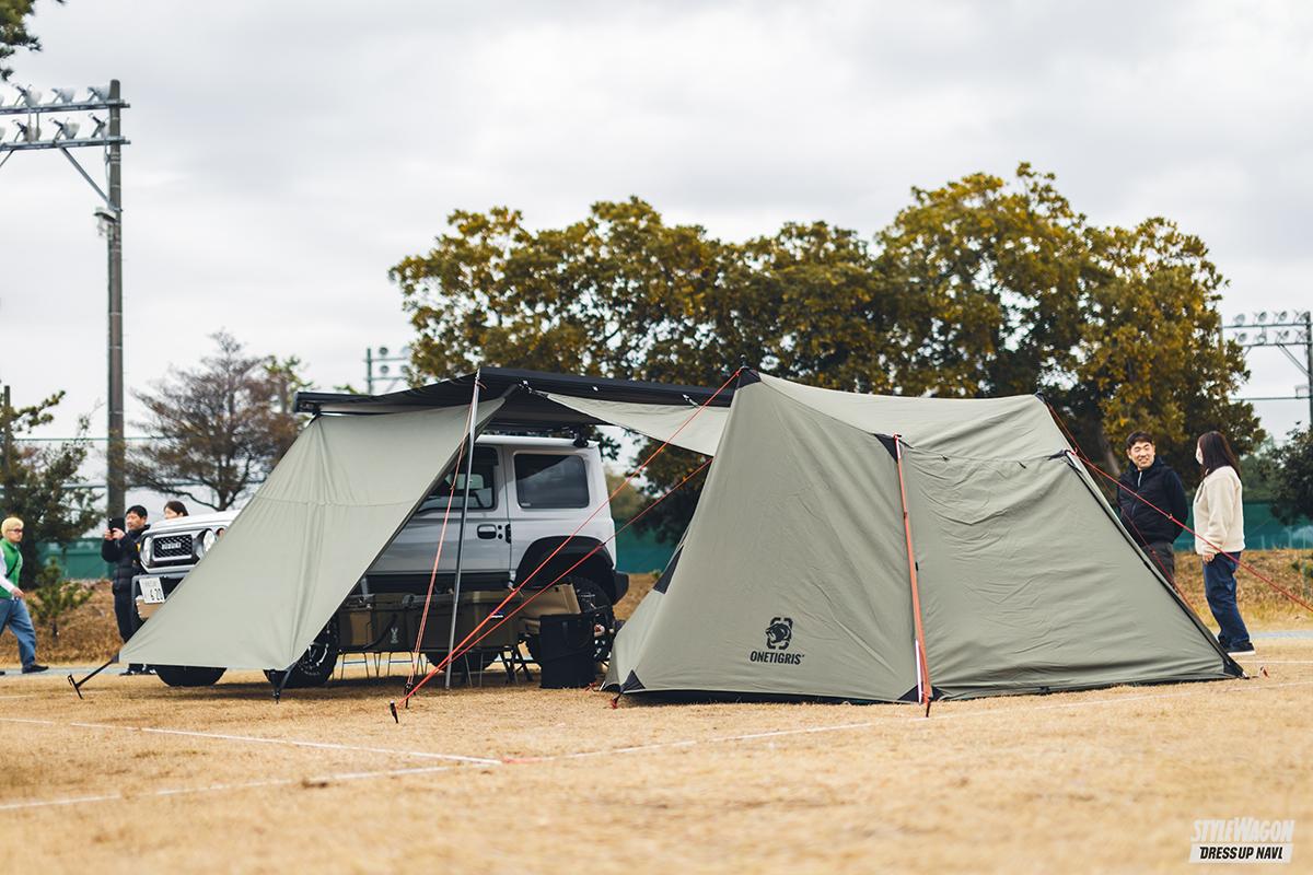 本当はデリカD:5に乗っている光チャンさんだが、今回はジムニーのイベントということで奥様と一緒にシエラでエントリー。実は娘さんの愛車であり、カスタマイズは父である光チャンさんの趣味がモロに反映されている。タイヤ&ホイールやマフラーなどひと通り手を加えているから、娘さんの友達からも好評とのこと。シエラでキャンプに行くのは初めてで、大量のキャンプギアを積むのは大変だったとか。今回はハイエース用のサイドオーニングを装着したが、シエラには少々長すぎて「失敗しました」。