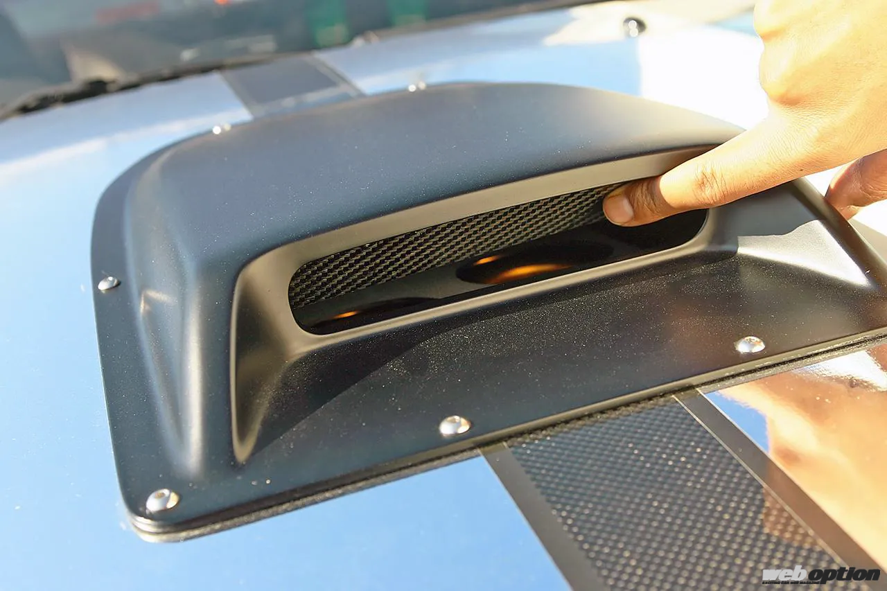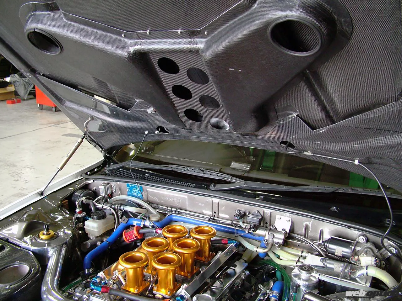 エアロチューニングも徹底。バンパーの左右開口部から入った走行風は、ヘッドライト後方のエアクリーナーボックスを通過し、ボンネット裏のダクトから各スロットルへと送り込まれる。計算し尽くされたその吸気経路が、6連スロットルの効果を最大限に引き出してくれるのだ。