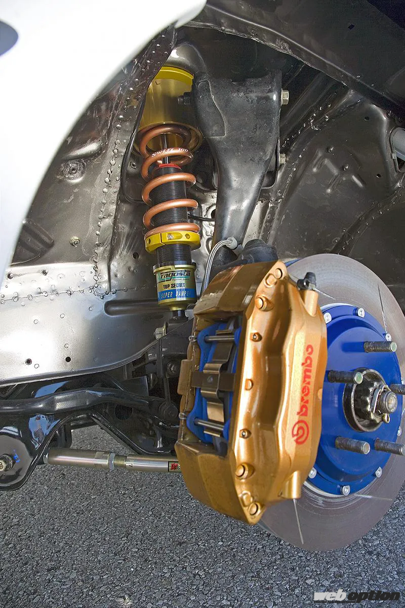 足回りは、アラゴスタベースのオリジナル車高調を装着。スプリングはスウィフト製で、フロント12kg/mm、リヤ9kg/mmというストリート重視のレートだ。アッパーマウント部には、スイッチ操作によりエア圧で瞬時に車高を上げ下げできるロベルタカップも組み込まれている。
