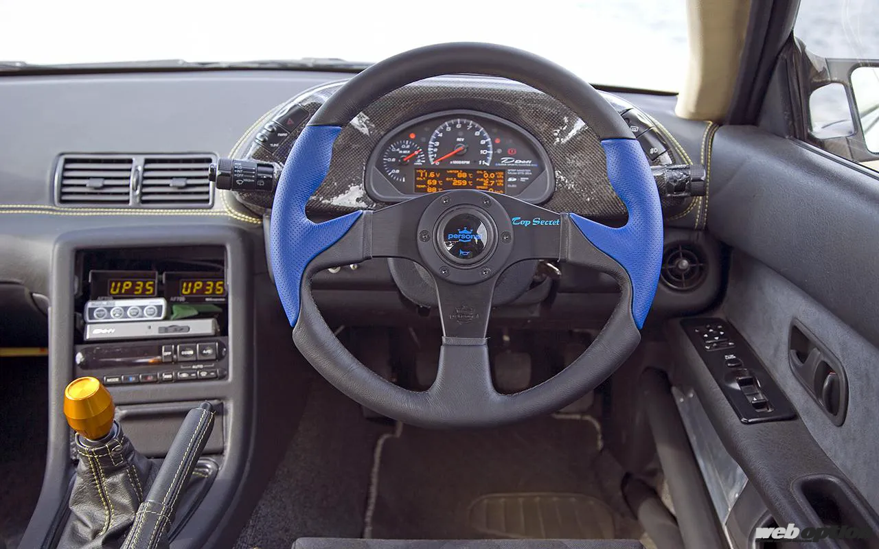 デフィのオールインワンメーターDSSCがコンバートされたコクピットも新鮮。質感向上もマシンメイクにおけるコンセプトのため、エアコンやオーディオ等の快適装備はフル搭載だ。