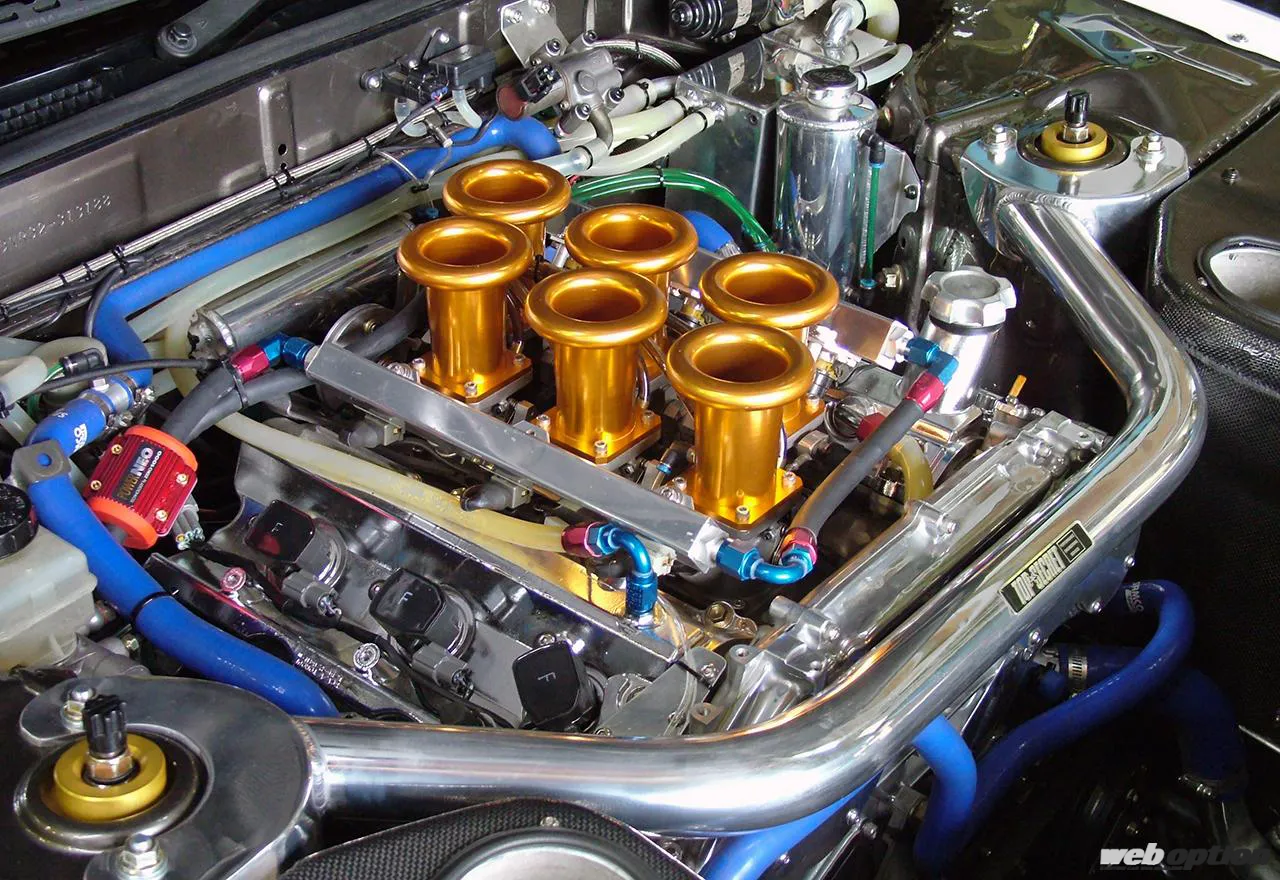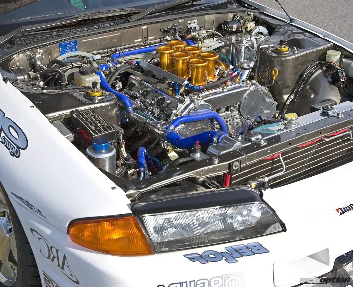 エンジンルーム内で存在感を主張する6本のエアファンネル。このBNR32は、VQ35DEのNAチューニングを進めていく上で大きな壁となる“吸気系の容量不足”を独自の6連スロットルキットで解決した“トップシークレット”のテストカーだ。