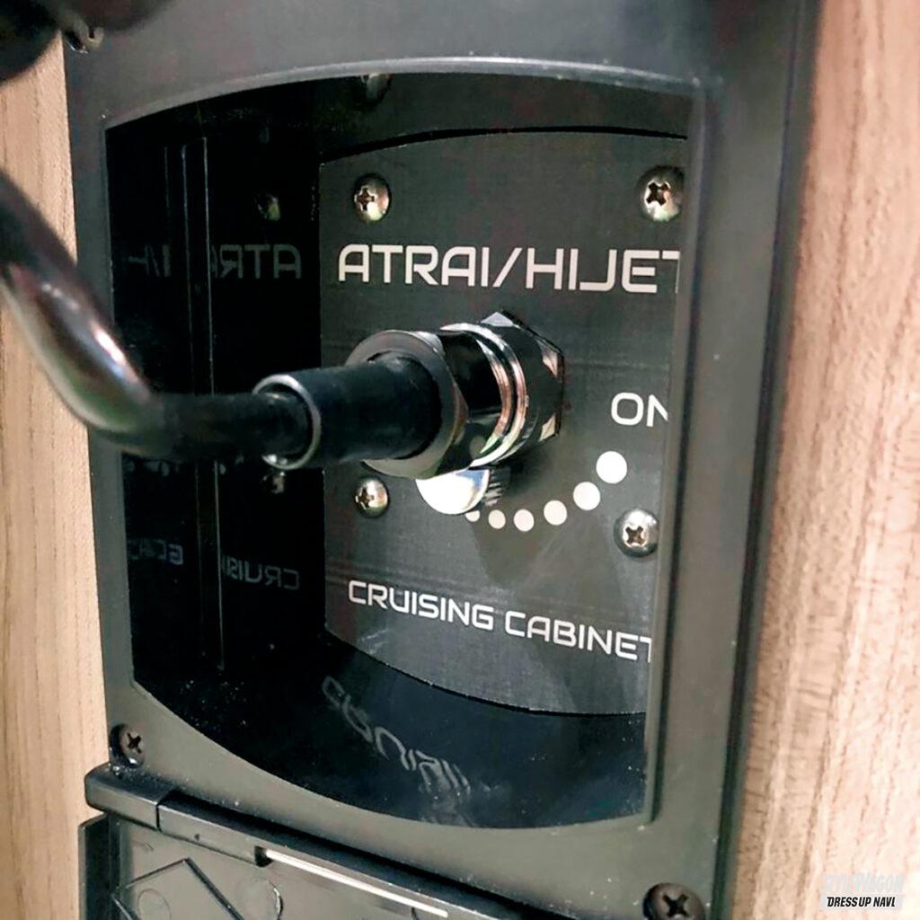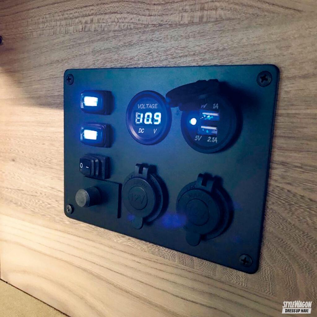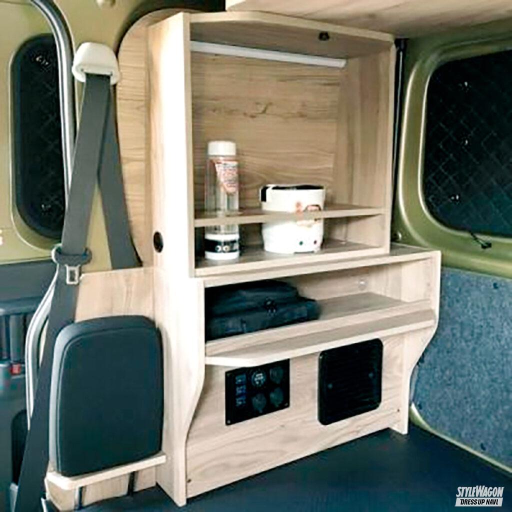 車種専用設計のラックとテーブル板をセットにしたクルージングキャビネットは、手軽にキャンピングカーのような装備が手に入る。キャンプだけでなく、万が一の災害時で車中泊することになっても快適に過ごせる。またシガーソケットやUSBポートも装備しているが、サブバッテリーは不要。もちろんポータブル電源にも対応している。