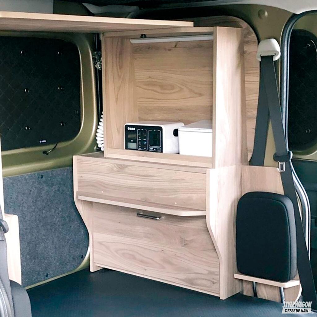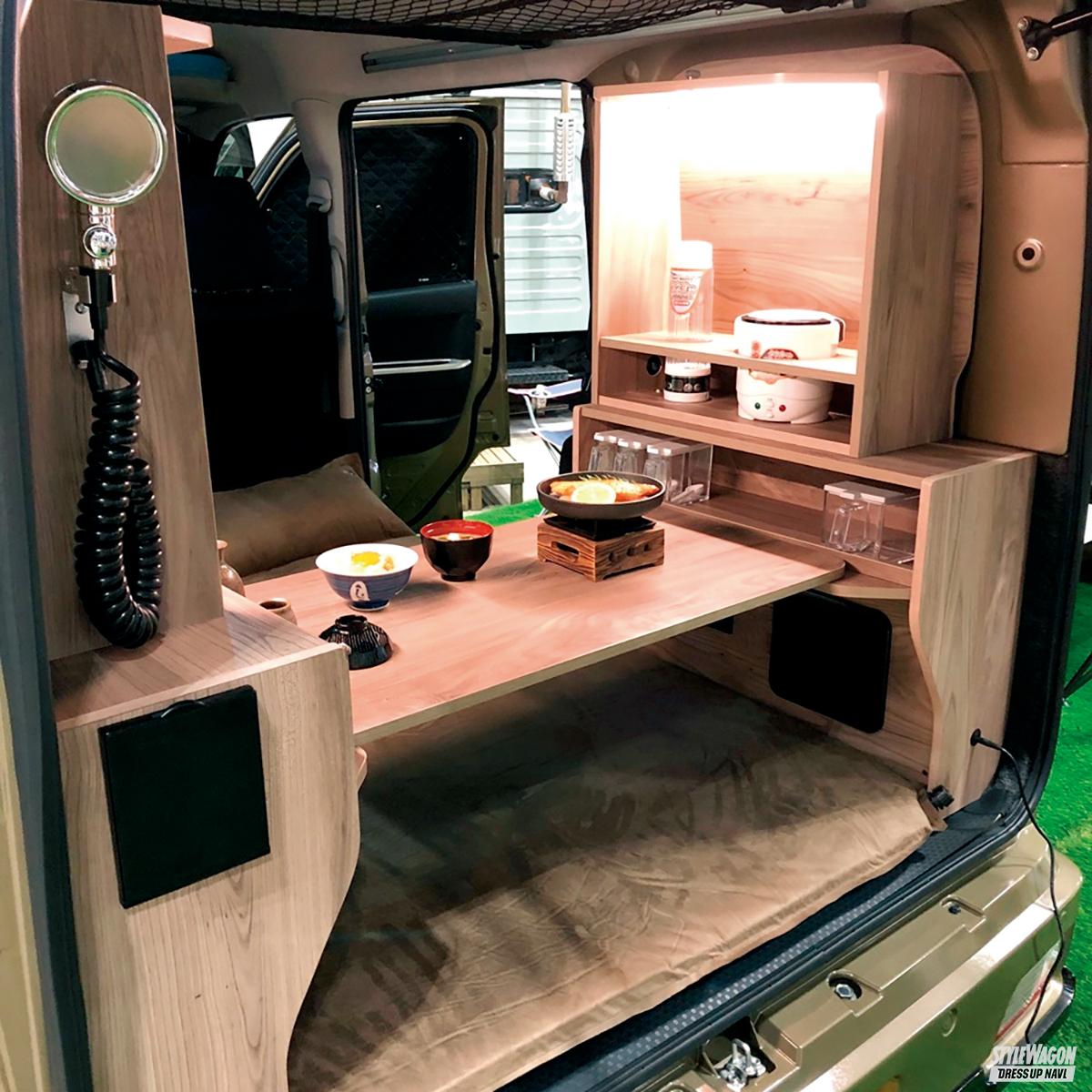 車種専用設計のラックとテーブル板をセットにしたクルージングキャビネットは、手軽にキャンピングカーのような装備が手に入る。キャンプだけでなく、万が一の災害時で車中泊することになっても快適に過ごせる。またシガーソケットやUSBポートも装備しているが、サブバッテリーは不要。もちろんポータブル電源にも対応している。