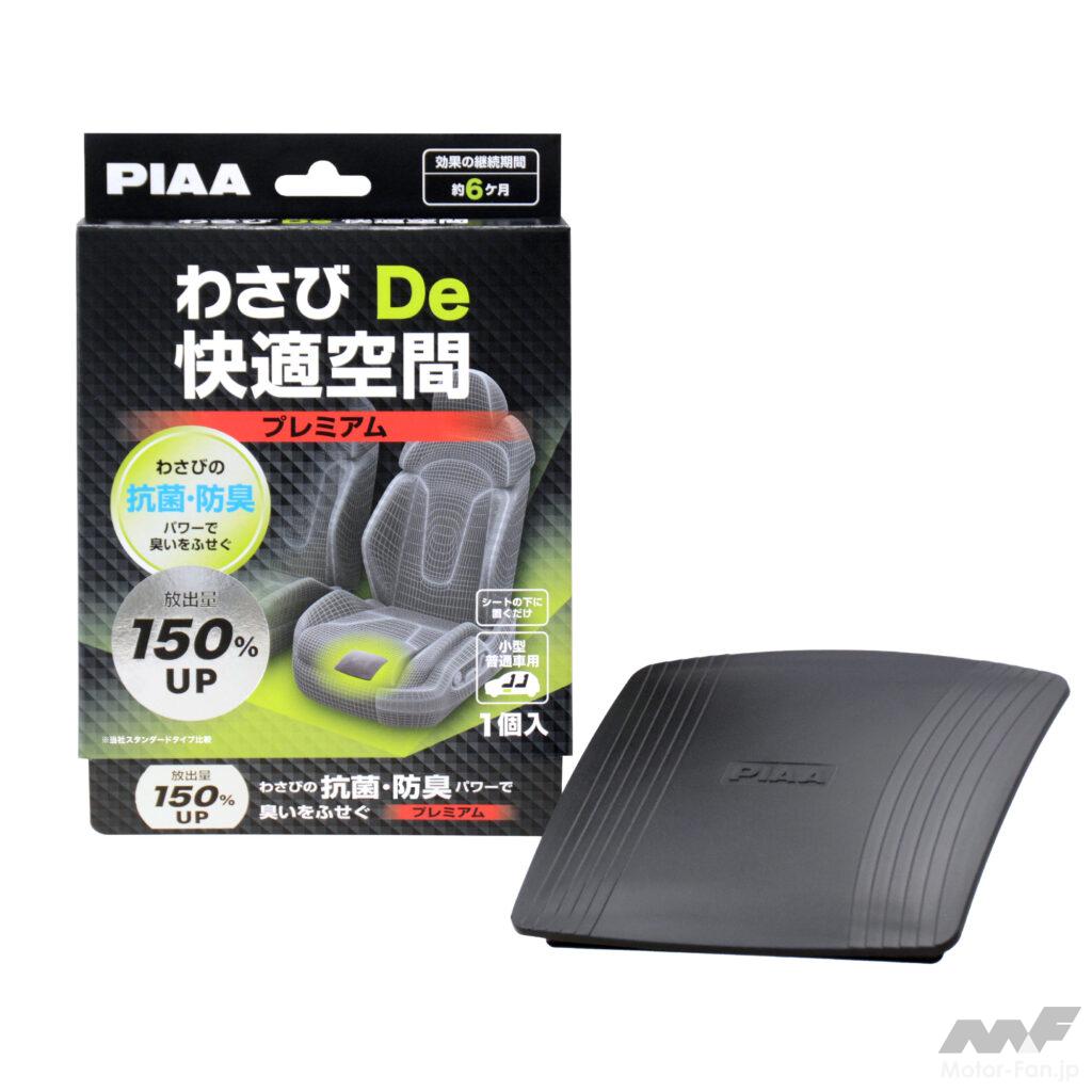 PIAAの『わさびDe快適空間』は、わさびに含まれる抗菌成分“アリルイソチオシアネート”を配合した抗菌・防臭剤。シートの下など車内に置くだけでカビ菌の発生を抑えることができ、不快な臭いを発生させない。