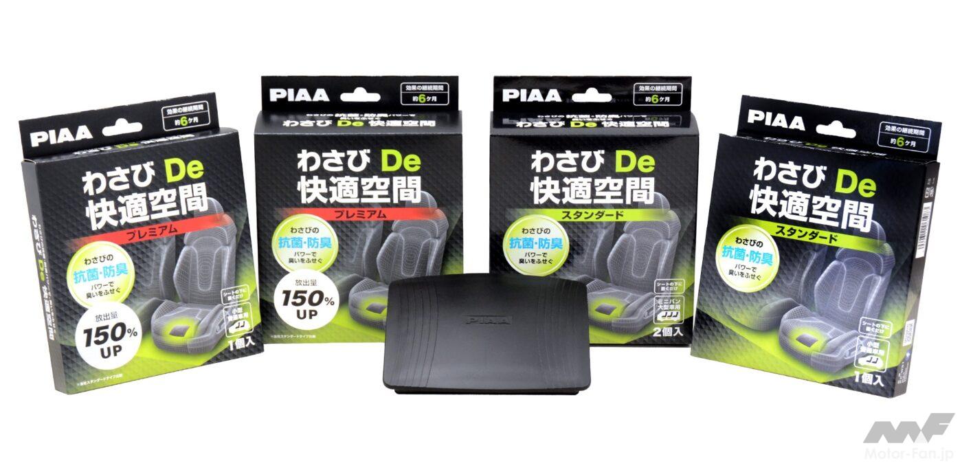 PIAAの『わさびDe快適空間』は、わさびに含まれる抗菌成分“アリルイソチオシアネート”を配合した抗菌・防臭剤。シートの下など車内に置くだけでカビ菌の発生を抑えることができ、不快な臭いを発生させない。