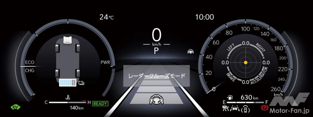 先進装備では、最新の予防安全技術「レクサスセーフティシステム+」が進化した。各機能を進化させるとともに、プリクラッシュセーフティ(PCS)の検出対象および機能を拡大。具体的には、ミリ波レーダーと単眼カメラを組みわせたセンサーにより高い認識性能と信頼性を担保することで、作動対象を拡大し、自動二輪車[昼]や自転車運転者[夜]の検出対象に拡大している。また、交差点衝突回避支援(出会い頭車両)機能も新たに装備することで、従来のPCSの作動範囲に加えて、交差点で交差する車両・自動二輪車に対しても、衝突回避の支援を行う。