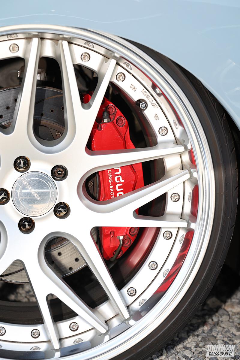 今回の主役、風レガさんは、SUBARU好きオーナーで、B4(セダン)からツーリングワゴンに乗り換えたそう。オールペンをしたが、コレもXV等で採用されるクールグレーカーキ。今やSUBARU車の定番色と言っても良いか!? そして最大の特徴はタイヤ&ホイールまで含めた足まわりだ。ボルドワールドのエアサスをベースに、アーム類まで手を入れることで見栄えする前後キャンバー角を獲得。ホイールは輸入車乗りにも人気のグノーシスを、絶妙なマッチングでセットアップ。“魅せる”場面でフェンダーアーチがリムに軽く被るスタイルになるようまとめた。さらにそのホイールの奥には真っ赤な大型キャリパーを導入。