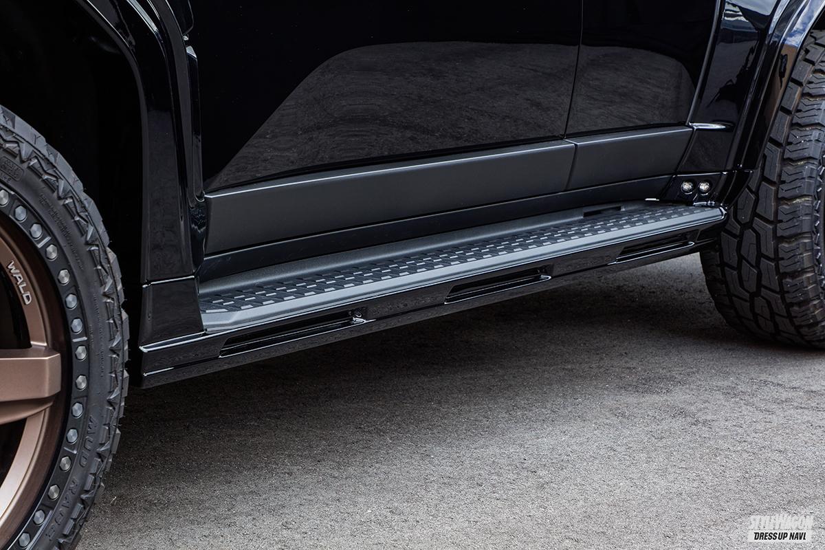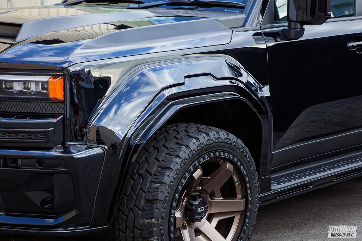 先行してCGが公開され、大阪オートメッセでプロトタイプがお披露目となったヴァルドのランドクルーザー250。圧倒的なまでのオーラを放つスタイリングで、大きな話題を集めたのは記憶に新しいところ。そんな大注目のボディキットの価格が、遂に決定したから見逃せない。今作、ランクル250用のボディキットは、オフ系シリーズのデザートラインからのリリースで、フラッグシップであるブラックバイソンの名が冠される。スタイリングの核となる前後スポイラーやオーバーフェンダーをはじめ、フロントバンパーガーニッシュ、ボンネットスクープも設定。さらにフロントルーフスポイラーとリアルーフウィングも鋭意開発中。唯一無二の存在感を獲得できる、豊富なラインアップが用意されている。