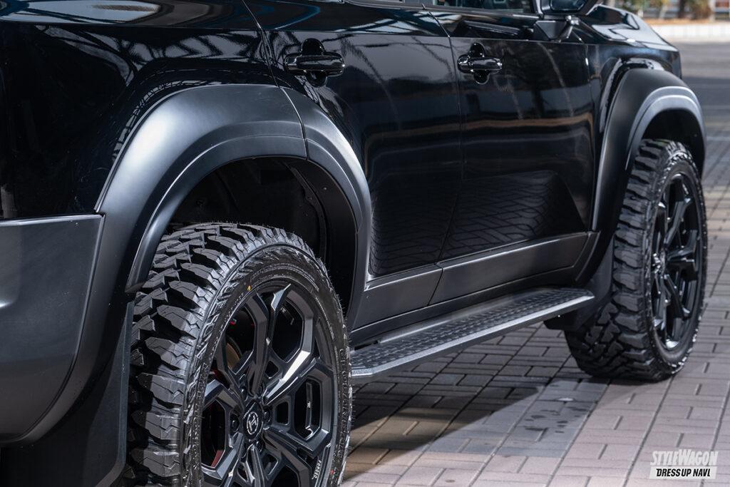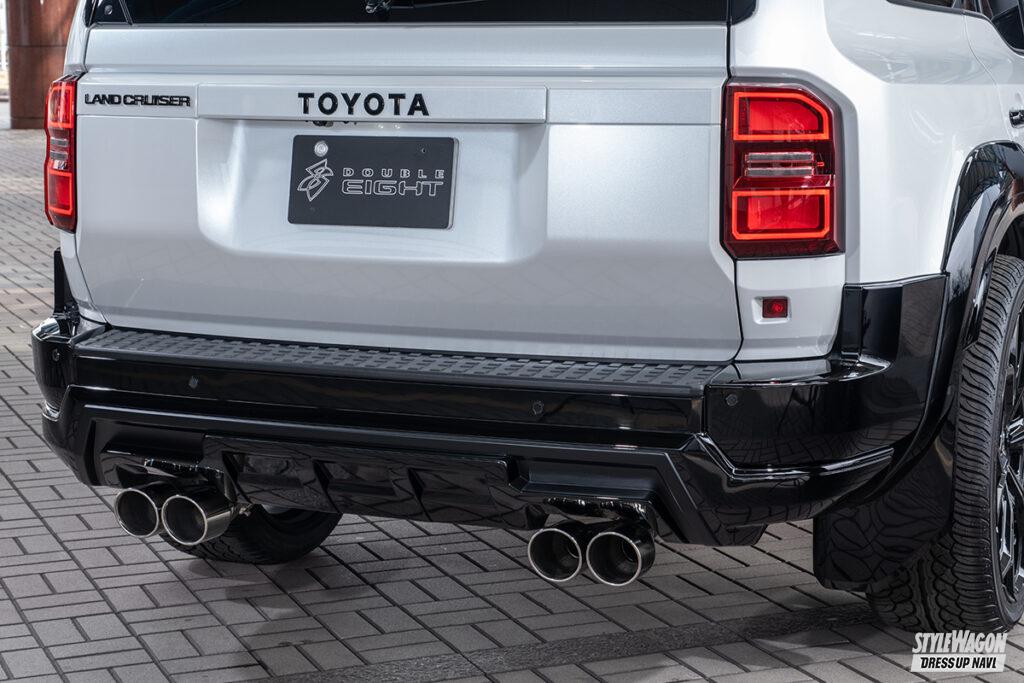 四駆&SUVパーツブランド、ダブルエイトが手がけるランクル250用プログラムは、純正デザインと調和し、物足りなさを解消する逸品が揃う。ひとつひとつのパーツは、独立して装着できる設計となっているため、トータルメイクはもちろんのこと、部分的に取り入れたり、他社製パーツと組み合わせたりと、コーディネイトは自由自在。アゲとサゲ、異なるコンセプトで仕上げた2台のデモカーを見てわかる通り、どんなスタイルにも絶妙にマッチ。自分だけのカスタムを楽しめるボディキットとなっている。