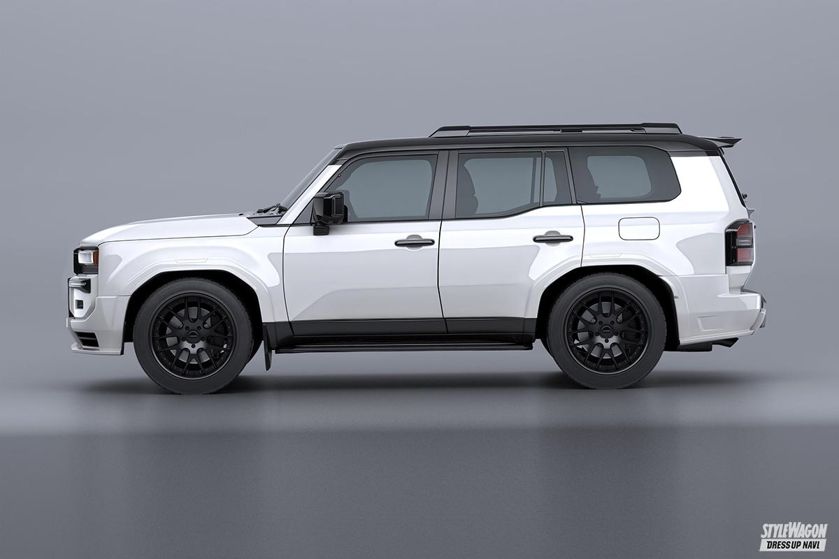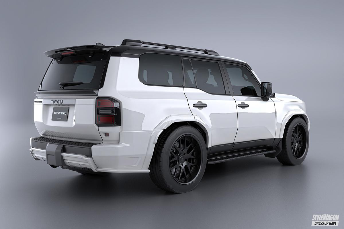 停まっていても走る姿をイメージできる〝アクティビティ&デザイン〟をコンセプトに掲げるアーティシャンスピリッツが、ランクル250を開発中との情報をキャッチ! 入手したCGを見るとスッキリとしたスタイルとの印象を受ける。純正ラインを活かしつつ、「違う!」と感じられるスタイルが追求されているようで、派手さではなく、〝整った違和感〟を提案するというワケだ。アイテムは前後スポイラーのほか、フェンダー、リアのゲート&ルーフスポイラーの5点を想定。シンプル&スタイリッシュなシルエットながら、フェンダーは片側30㎜ワイドとナカナカの迫力。〝整った違和感〟をもっとも象徴するパーツになりそうだ。