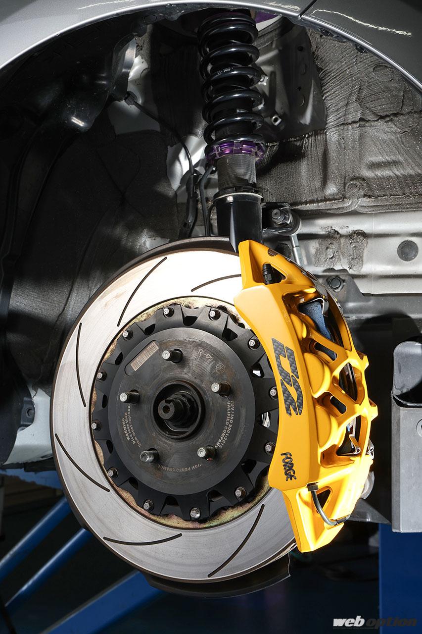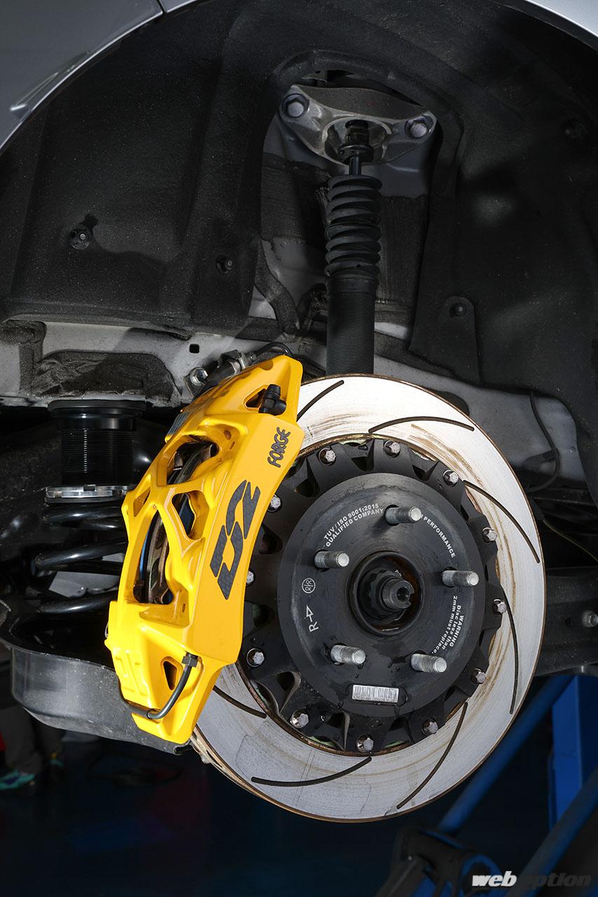 大胆に肉抜きを施したスポーツホローキャリパーと、センター部に鍛造アルミを用いたローターの恩恵もあり、合計の重量を純正から約1kg増に抑えたのもポイントだ。制動力の高さやコントロール性、ドレスアップ効果などを考えれば、その恩恵は計り知れない。
