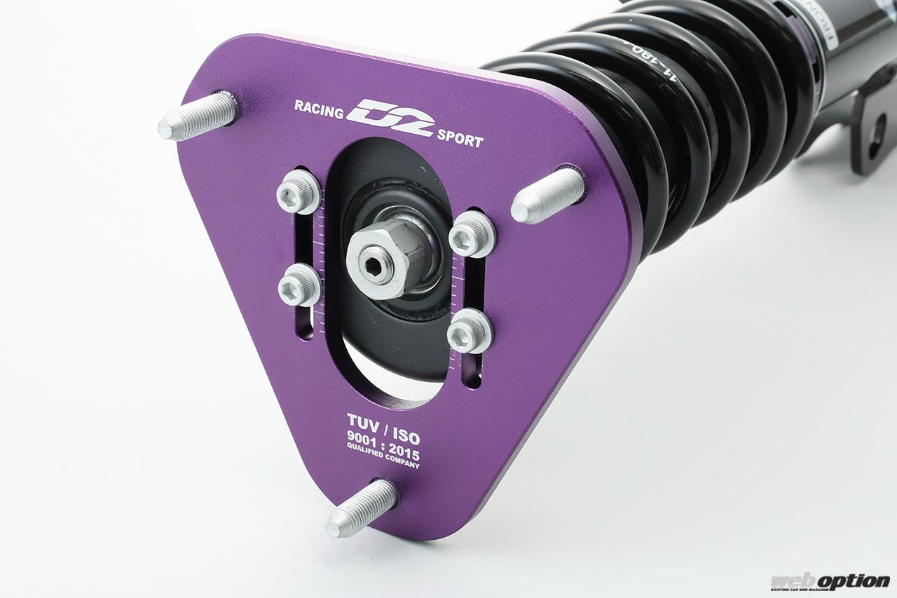 フロントのアッパーマウントはピロボールとゴムを組み合わせ、ステアリングのダイレクトな操作性と異音の抑制を両立。キャンバーも調整でき幅広いセッティングに対応するスペックだ。