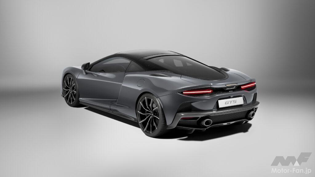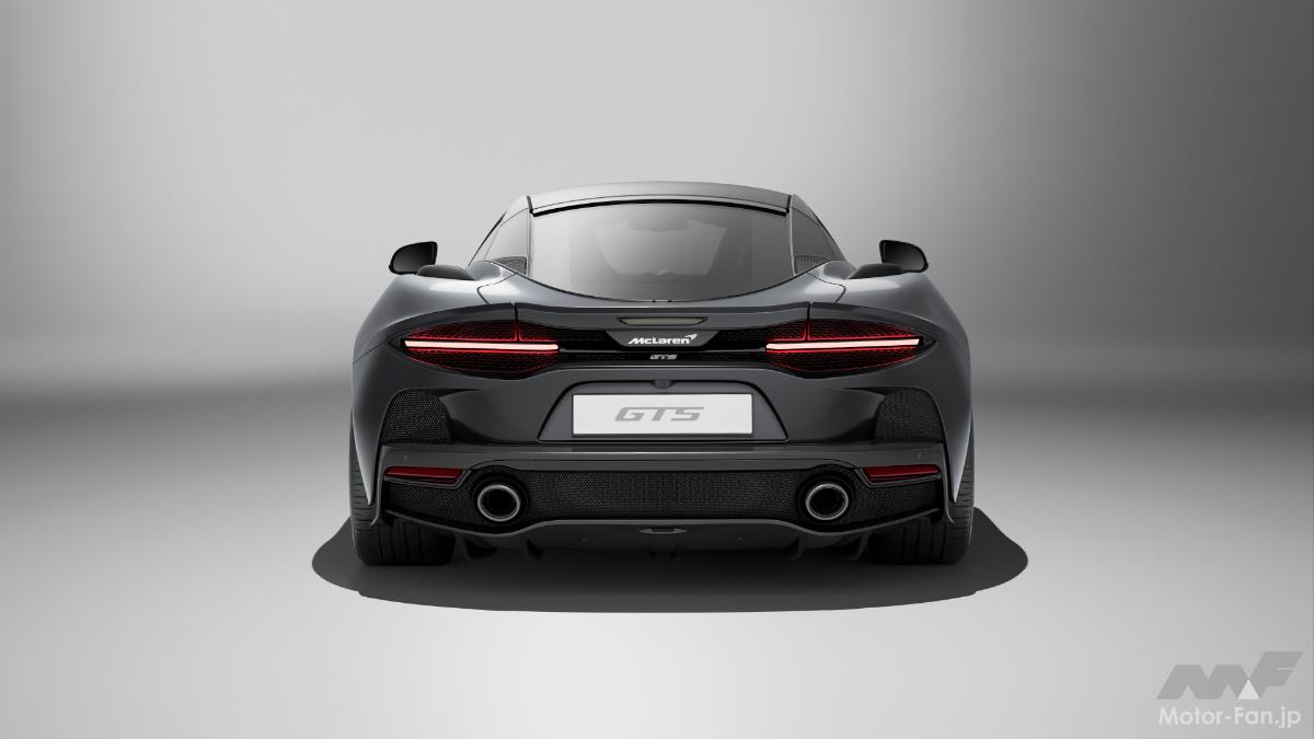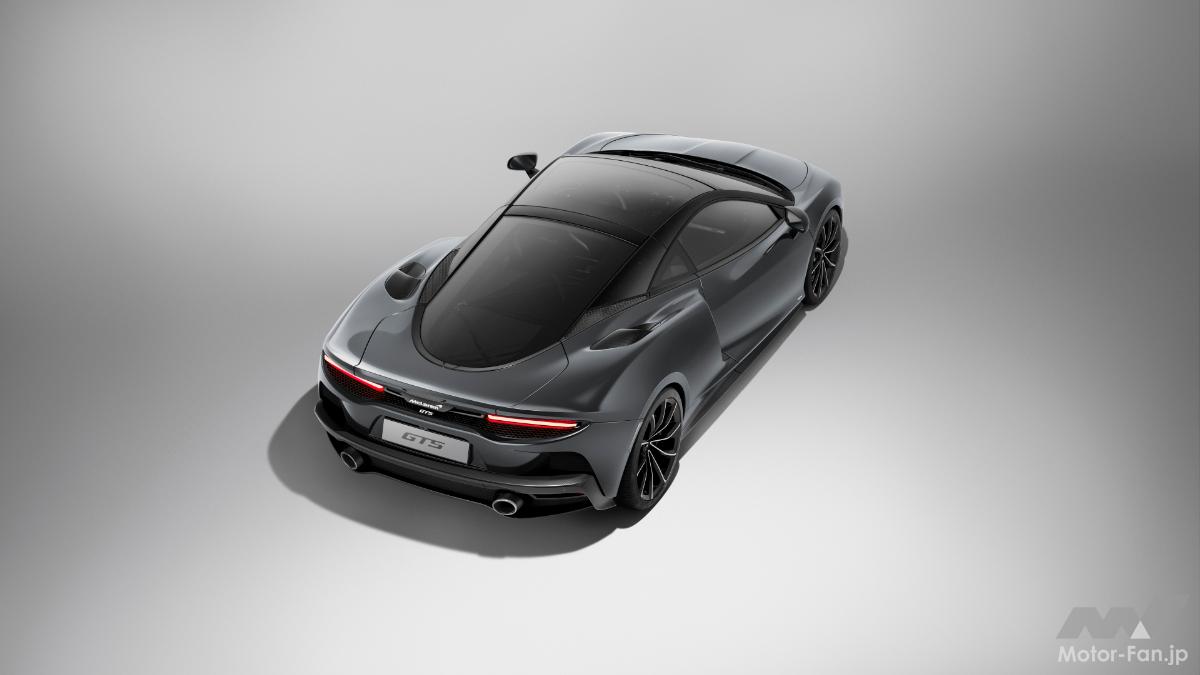新型GTSは、モノコック・シャシー中心の軽量なカーボン・ファイバー製ストラクチャー、卓越したドライビング・ダイナミクスといったマクラーレンの核となる魅力はそのままに、いっそう力強いビジュアルを実現している。GTが誇るエクステリアのエレガントなラインは、エアロダイナミクス・パッケージやシルエットのベースとして引き継ぎつつも、GTSはいっそう主張の強いデザインとなっている。特徴的な「ハンマーヘッド」のフロント・バンパーのスタイリングも刷新され、エア・インテークも新しいフォルムに変更された。インテークの幅が拡大したことで、ラジエーターに送り込む空気の量も増大しており、機能性も向上している。リアフェンダーにおいては、車両の肩にあたる部分のエアスクープが新たに採用された。