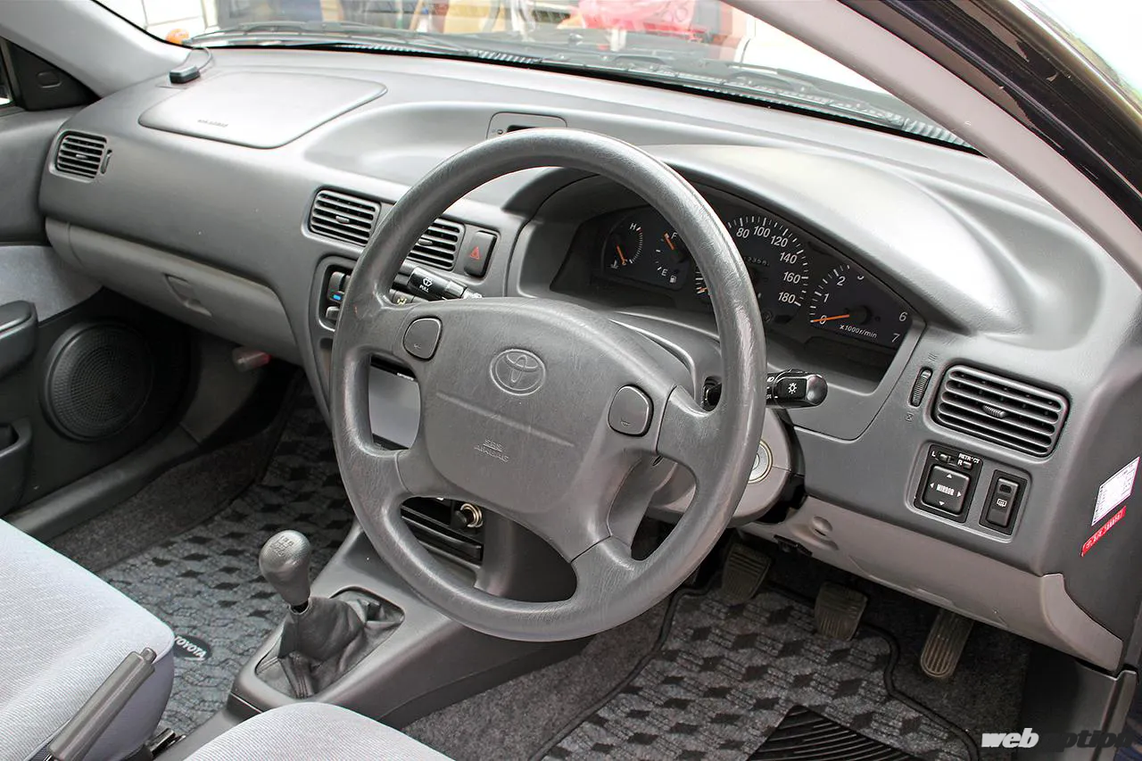 素材やデザインによって大衆セダンのコルサでも安っぽさを感じさせないのがトヨタの真骨頂。運転席、助手席エアバッグは全グレードに標準装備される。メーターは、スピードメーターを中心として右側にはVIT-Xのみに装備されるタコメーターを、左側には水温計と燃料計を配置。