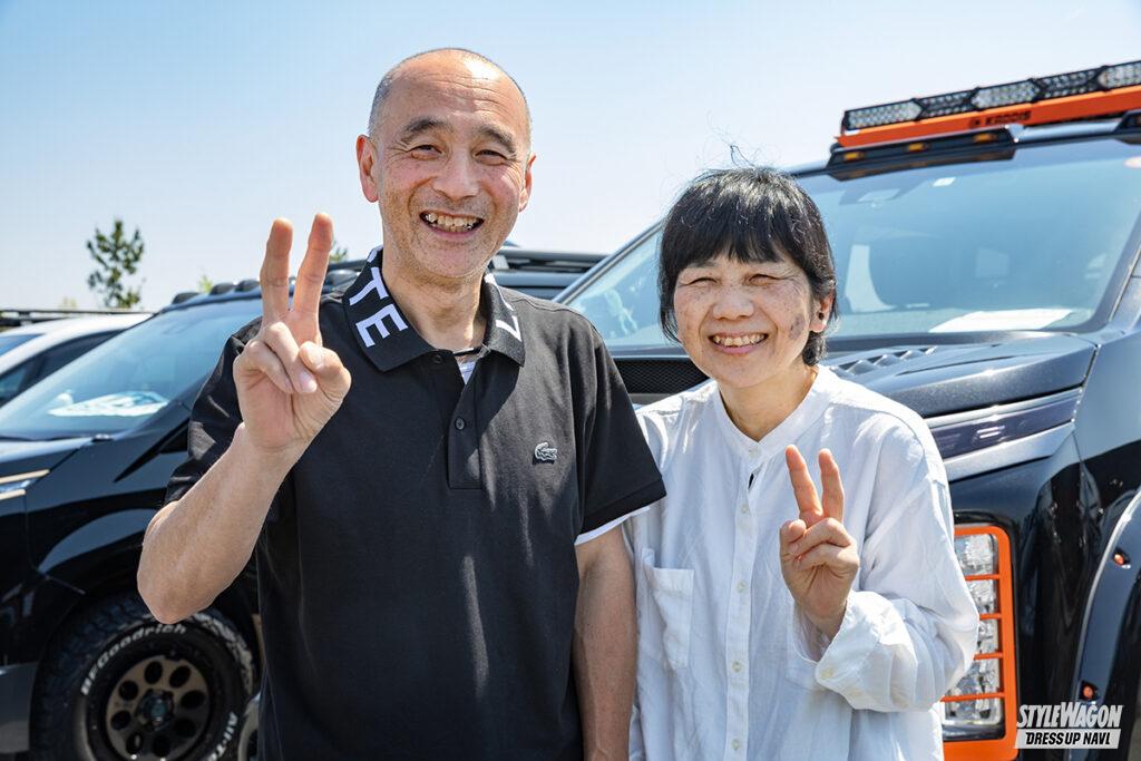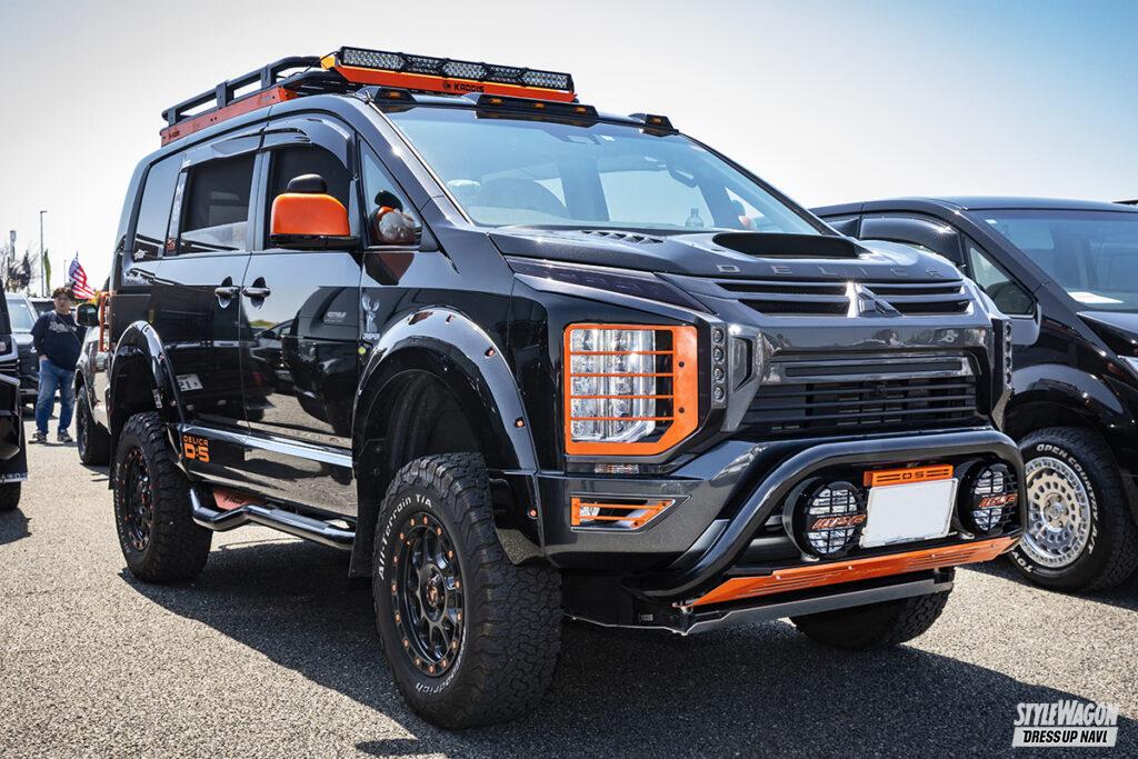 大型のエアインテークダクトを備えたボンネット、グリル、オーバーフェンダーなど、カディスのボディパーツでコーディネイトされたD:5を所有するシゲオさんは、横浜からの参加。足まわりはカディスのキットで7インチリフトアップ。ヘッドライトガードやドアミラー、ルーフキャリアにさりげなくあしらわれたオレンジのアクセントも演出効果バツグン!